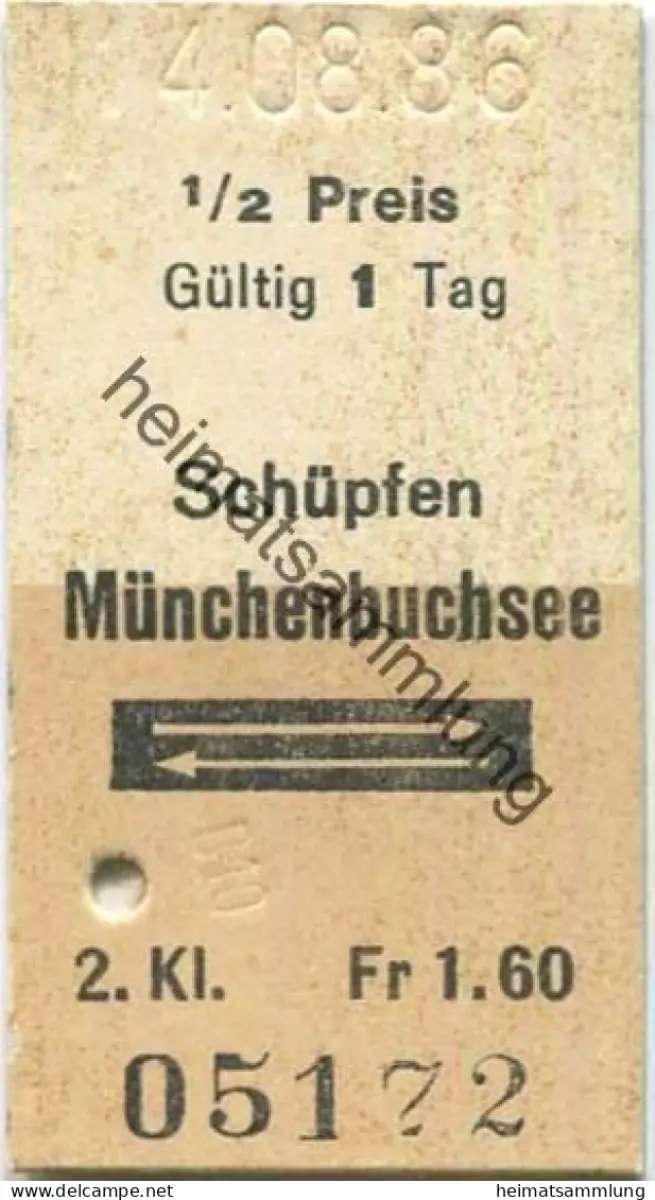 Schweiz - Schüpfen Münchenbuchsee retour - Fahrkarte 1/2 Preis 1986