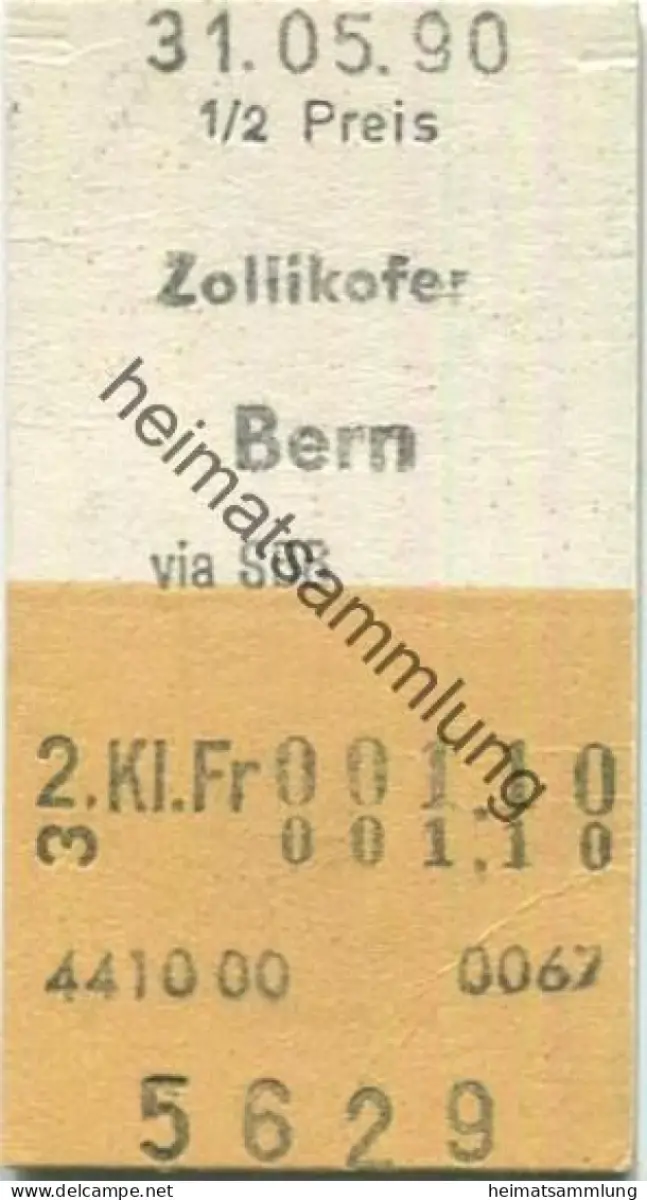 Schweiz - Zollikofen Bern via SBB einfach - Fahrkarte 1/2 Preis 1990
