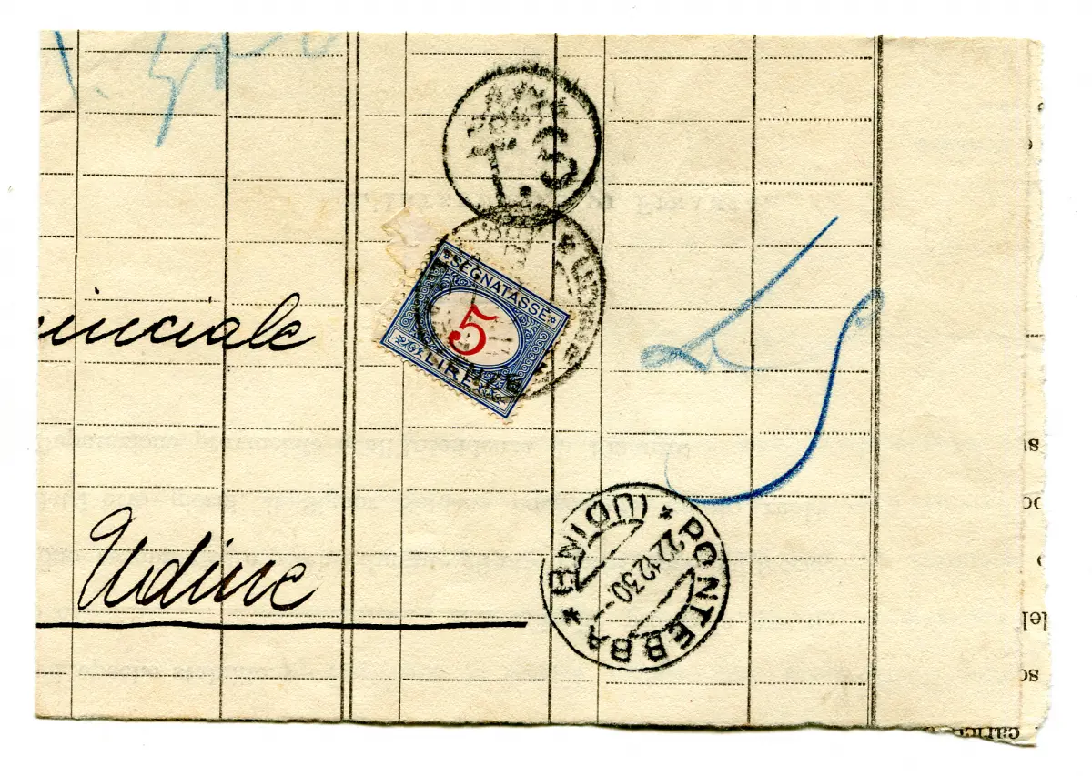 Segnatasse l. 5 Nr. 30 isoliert auf überwiegend Briefumschlag Fragment - Steuermarken l. 5 Nr. 30 isoliert auf einem Großteil der Posthülle (Gebühr erhoben) von Pontebba nach Udine am 22.12.30 - Ungewöhnlich Cod. 79/16