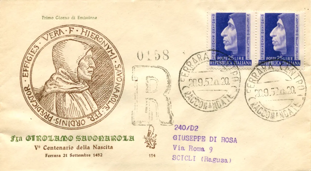 Savonarola Nr. 696 Paar auf Einschreiben mit Ankunftsstornierung - Sehr schöner Cod. 381/16