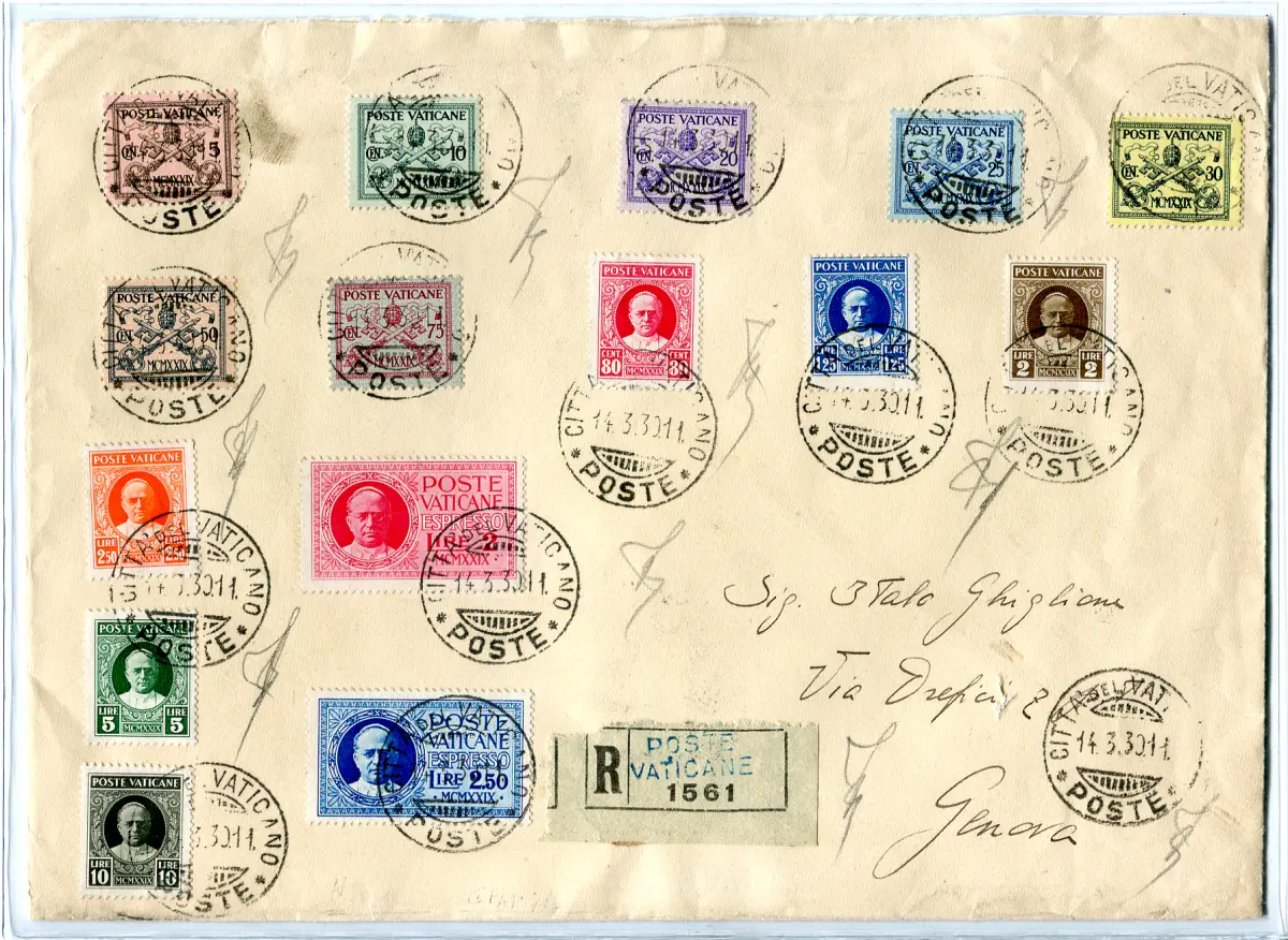 Serienabstimmung auf Umschlag racc. für Genua Umschlag - Schlichtungsnr. 1/13 + Espressi Nr. 1/2 die komplette Serie auf Einschreibenumschlag für Genua am 14.3.30 - auf der Rückseite Ann. Transit und Ankunft Cod.1129/WEB