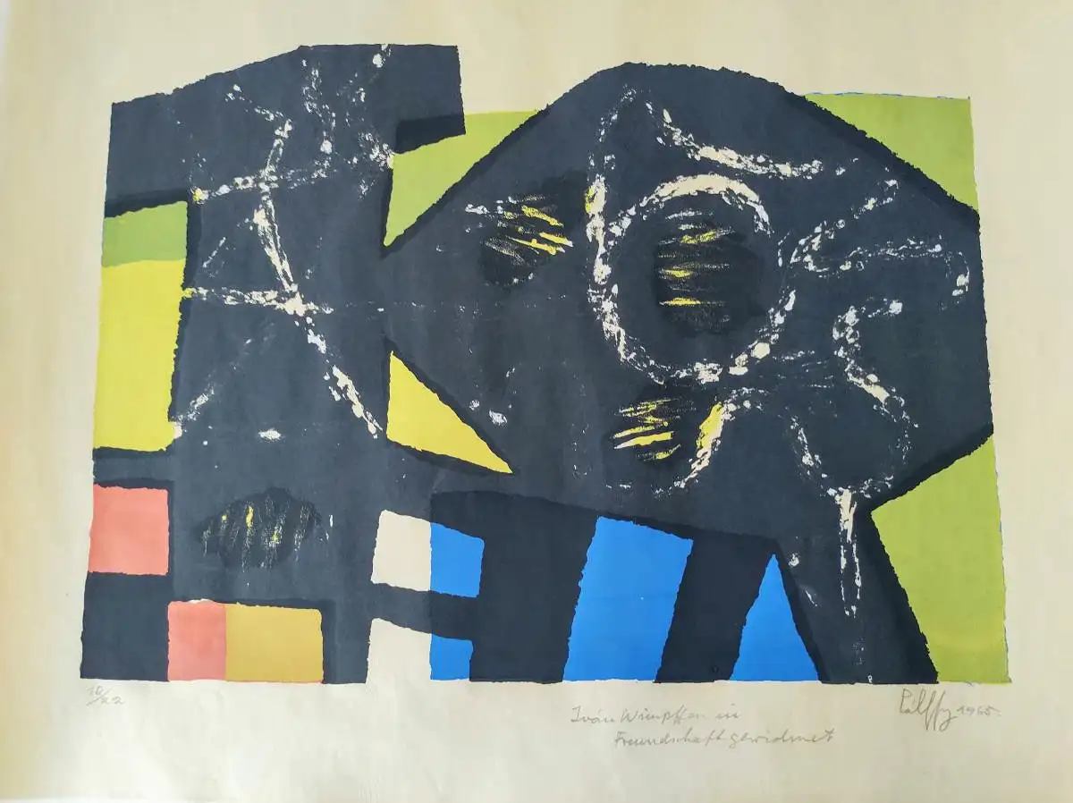 Limitierte Serigrafie „Iván Wimpffen in Freundschaft gewidmet“ von Peter Pálffy, nummeriert 18/22. Mit handschriftlicher Signatur auf Wasserzeichen-Japanpapier. Lebendige abstrakte Komposition mit geometrischen Formen und kräftigen Farben. Guter Zustand. Ideal für Sammler zeitgenössischer Kunst oder Liebhaber von Pálffys abstraktem Stil als dekorativer Akzent.