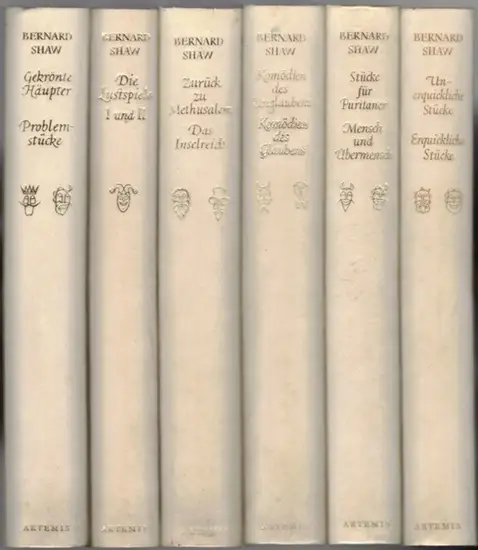 Titel: Gesammelte dramatische Werke. Autorisierte Deutsche Übersetzung von Siegried Trebitsch. Neue, vom Übersetzer durchgesehene Auflage. [12 Bände in 6:] [1] Unerquickliche Stücke. [2] Erquickliche Stücke. [3] Stücke für Puritaner. [4] Mensch und Übermensch. [5] Komödien des Unglaubens. [6] Komödien des Glaubens. [7] Zurück zu Methusalem. Ein metabiologischer Pentateuch. [8] Das Inselreich. [9] Die Lustspiele I. [10] Die Lustspiele II. [11] Gekrönte Häupter. [12] Die Problemstücke