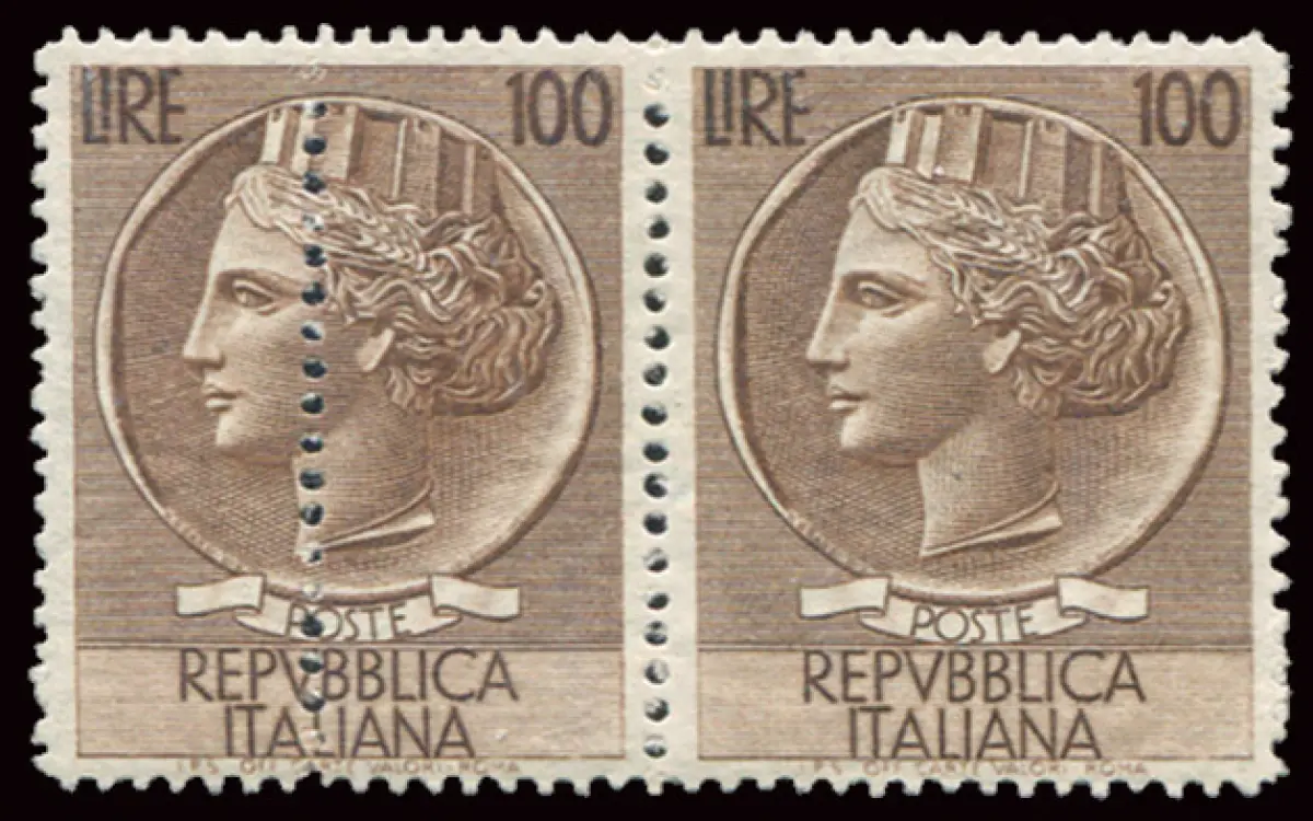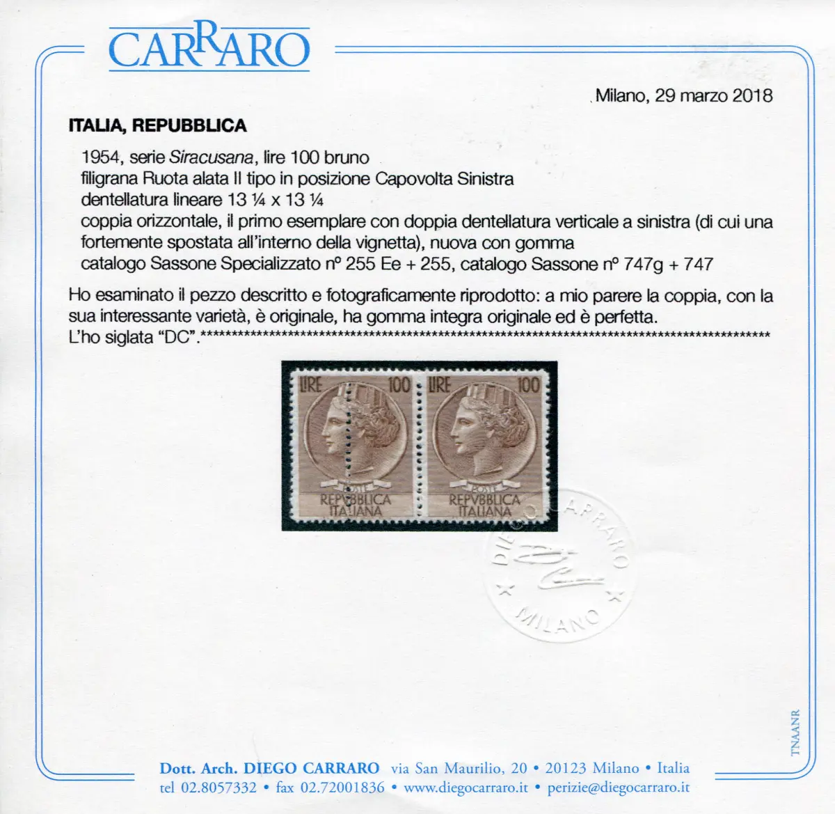 Siracusana Lire 100 n. 747g Paar Sortenverzahnung Vollgummi - MHN - - - Syracusana Lire 100 Nr. 747g horizontales Drehmoment, das erste Exemplar mit doppelter vertikaler Verzahnung links (davon eine stark innerhalb der Vignette verschoben) - Ungewöhnlich, gut zentriert - Cert. Carraro - Kat. euro 975+ Cod. 644/14