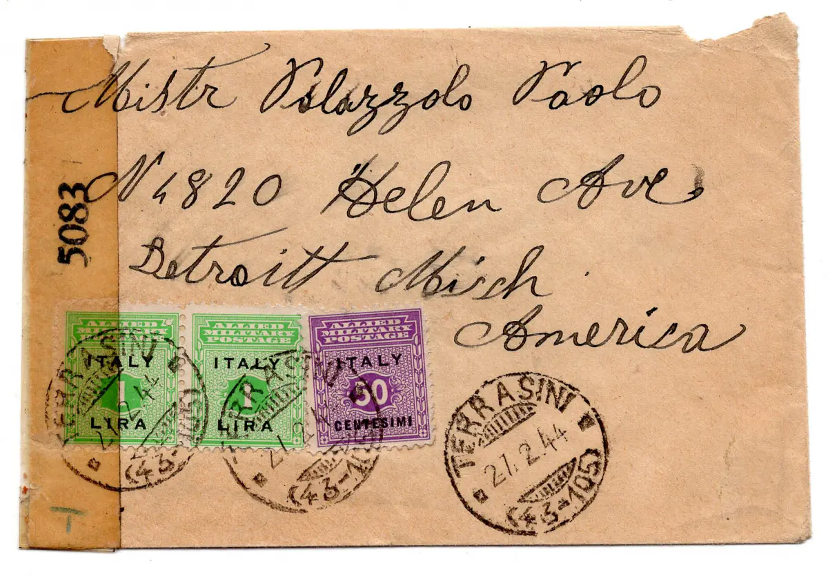 Sizilien Occ. Alliierte - Lire 1 Paar + Ergänzung auf Umschlag von Terrasini - Sizilien Occ. Alliierte - Lire 1 Nr. 6 Paar + Ergänzung Nr. 4 auf Umschlag von Terrasini für die USA am 27.2.44 - seitlich Zensurband - Ungewöhnlich im Auslandstarif Nr. 1169/20