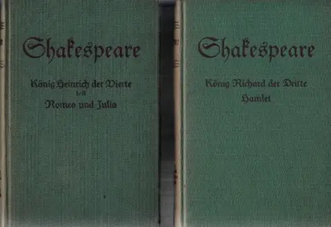 das Erscheinungsjahr ist geschätzt, die Seiten sind teils gebräunt, die EInbände sind fleckig und am Rücken ausgeblichen, Namenseintrag, In 2 Büchern lesen Sie folgende Stücke von William Sheakespeare: König Heinrich der Vierte (1. und 2. Teil) - Romeo und Julia - König Richard der Dritte - Hamlet Beschreibung vom Antiquariat Ardelt 2f1 Antiquariat Ardelt