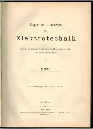 Slaby, Adolf: Experimentalvorträge über Elektrotechnik, gehalten im Auftrage Sr. Excellenz des Herrn Staatssekretärs des Reichs-Marine-Amts. Nach stenographischer Niederschrift. Mit 95 Figuren Berlin, in der Königlichen Hofbuchdruckerei von E. S. Mittler
