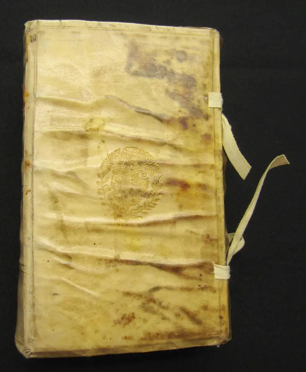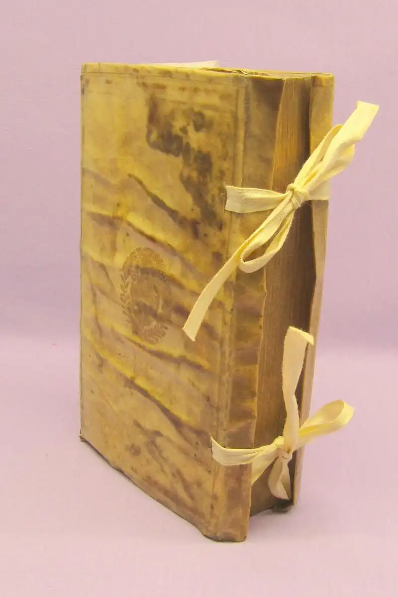 Einband berieben, bestoßen sowie angeschmutzt, hs. Rs., Bänder erneuert, Vorsatz und Titel mit hs. Vermerken, Papie altersbedingt gebräunt sowie braun- und fingerfleckig