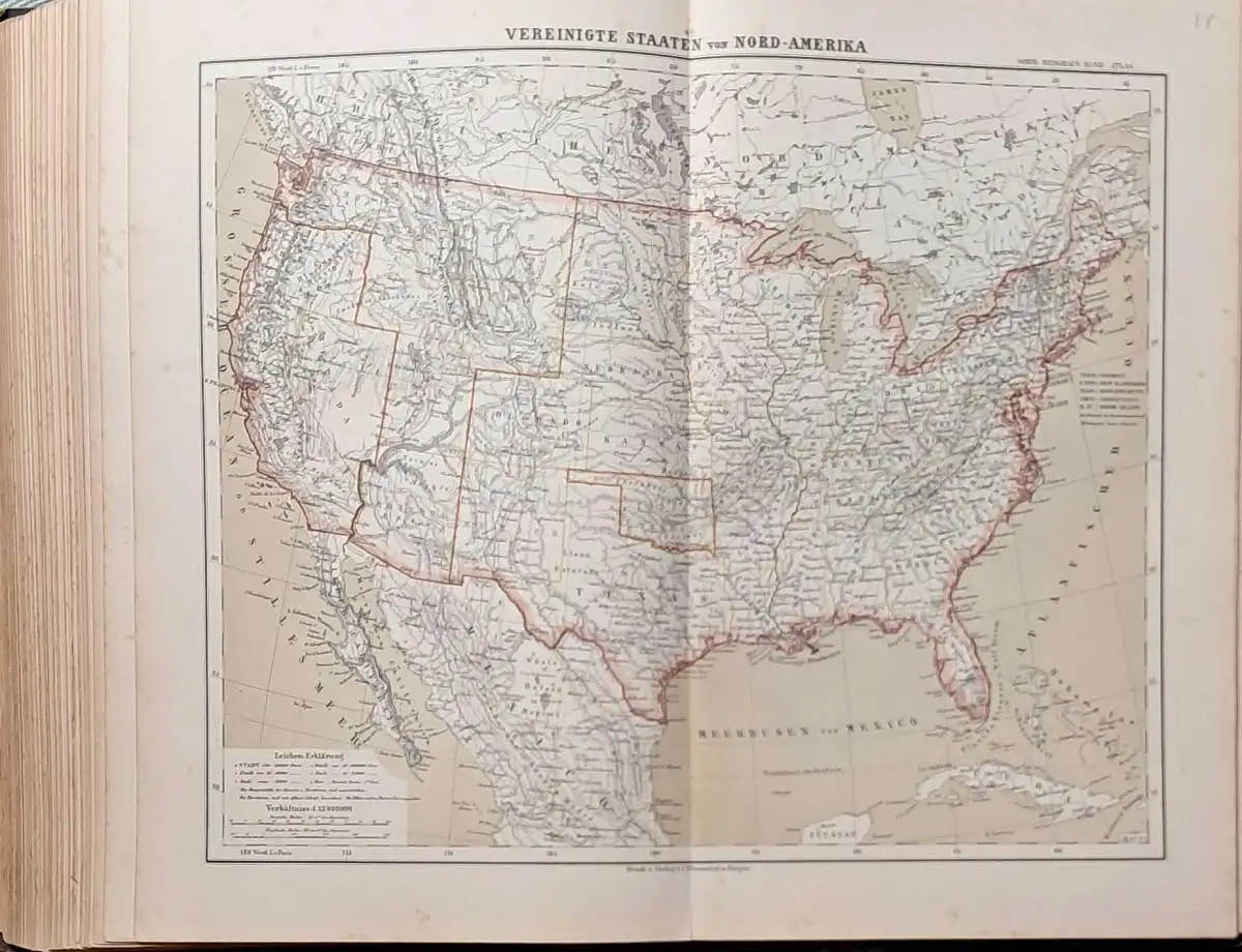 Seltener Handatlas (vgl. Espenhorst 6.7c - Seite 225) Der Hauptband (1858) enthält u.a.: Planetensystem, Sternkarte, Österreich-Ungarn (8 Karten), Deutschland u. Preussen (22 Karten), Italien, Frankreich, Spanien, Portugal, England, Irland, Holland (herausgetrennt), Belgien, Dänemark, Norwegen, Schweden, Russland, Kaukasus, Sibirien, Türkei, Griechenland, Indien, Asien, Palästina, China, Vorder-Indien (in 4 Extra-Bll.) Afrika, Algier, Marokko, Nordamerika (9 Karten), Mexiko, Südamerika (4 Karten), Australien.