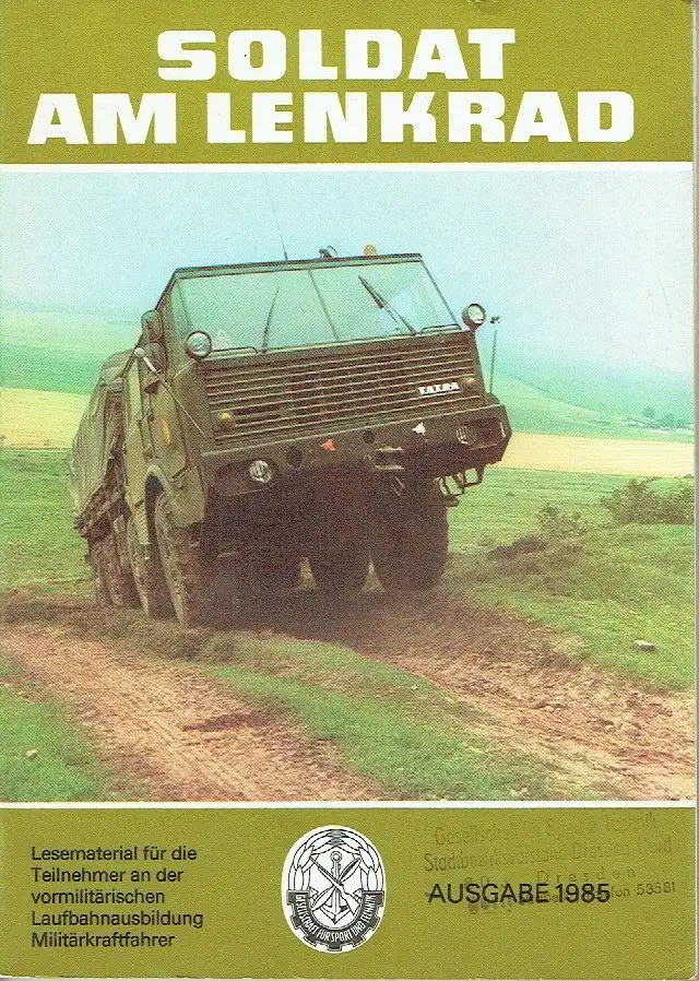 guter bis sehr guter Zustand, geringe Gebrauchs- und Alterungsspuren: Vorderseite rechts unten mit GST-Stempel - Umschlag und Seiten teils etwas eselsohrig - Deckel und die ersten 30 Seiten mit kleiner Blessur im oberen Rand - Seiten sauber und ordentlich, Vorbemerkung - Der Militärkraftfahrer — seine Verantwortung und Aufgaben - Militärische Kraftfahrzeuge gestern und heute - GAS, KrAS, MAS, URAL und TATRA - Sowjetische und tschechoslowakische Militärkraftfahrzeuge in der NVA - „Panther", „Tiger", „Königstiger" - Wie der Mythos einer Waffe zerbrach - Auf der „Straße des Lebens" - Über das Eis des Ladogasees in das eingeschlossene Leningrad - Im Visier der Ludwigsfelder: der 450 000. W 50! - Wann ist ein Fahrzeug geländegängig? - Instrumententafel des LKW W 50 L/A. Der W 50 in Daten - Tonnenschwere auf der Kfz-Lehrbahn - „Ural"-Fahrer der NVA und der Sowjetarmee im Leistungsvergleich - Marschrichtung ihrer Fahrzeuge: Osten! - Panzergrenadiere und Kraftfahrer der Bundeswehr werden im antikommunistischen Sinne für den "Tag X" gedrillt - Die „Prozente" der Rüstungshaie - Mit 20 Tonnen im Gelände - Bilder einer Fahrübung von Militärkraftfahrern - Herr über 156 kW (250 PS) - Berufsbilder: Unteroffizier, Fähnrich, Offizier des Kfz-Dienstes - Kamerad, wenn Du bei der „Fahne" bist, wirst Du z. B. eines dieser Fahrzeuge führen - GST-Motorsportler - Auf W 50 und „Ural" - Zu unserem Ausbildungsprogramm / Militärkraftfahrer - Abschlußübung in Piesteritz mit „Pfiff" - Wie muß unsere Ausbildungstechnik genutzt und instand gehalten werden? - Trainingsprogramm zur Fahrzeugbedienung (Klasse C), kartoniert, ca. 16,5 x 23, 96 Seiten mit zahlreichen Bildern