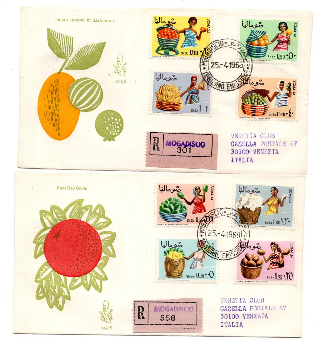 Somalia AFIS FDC Venetia 1968 Agricoltura voyata Racc. für Italien Somalia AFIS 1968 Landwirtschaft auf Umschlag FDC gereist Racc. für Italien mit Annullierung der Ankunft - Abreise - Abreise Stornierung Mogadischu Cod. 1667/Venetien