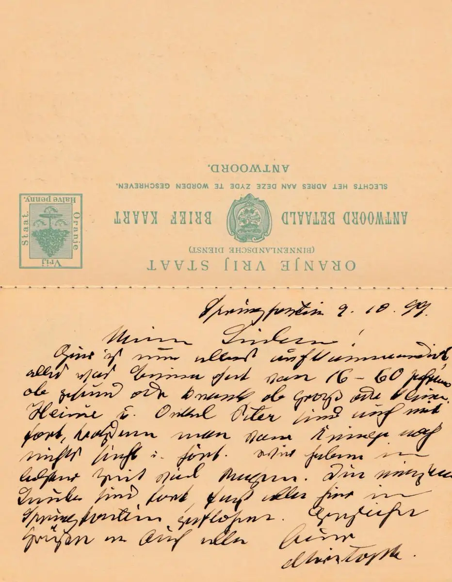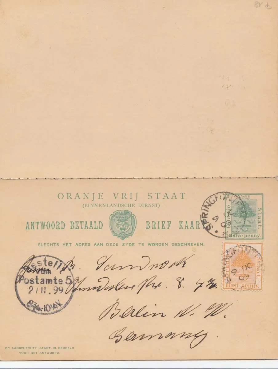 South Africa 1899: post card with response cart Springfontein to Berlin