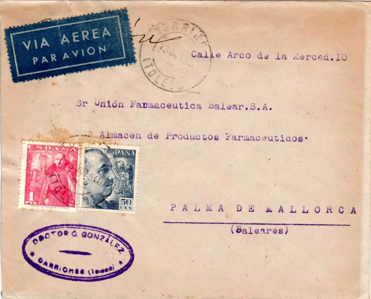 AMB. RAPIDO MADRID-CACERES rücks. auf Luftpostbrief m. 50 C.+1 Pta. v. Torrijo, Toledo nach Palma de Mallorca.