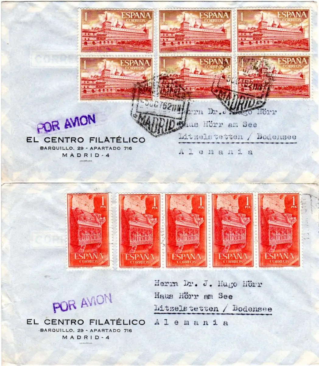 Mehrfachfrankaturen 6x1 P. bzw. 5x1 P. auf 2 Luftpostbriefen v. Madrid n. Lützelstetten am Bodensee.