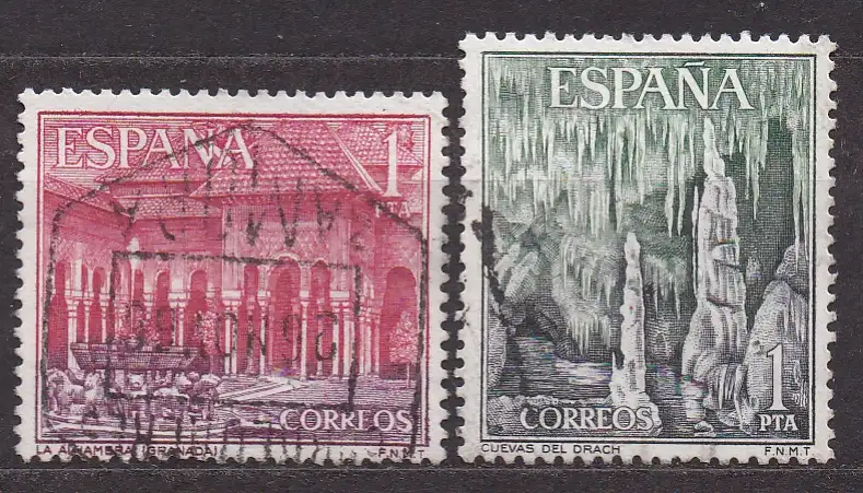 Spanien, Mi-Nr. 1439 + 1444 gest., Sehenswürdigkeiten: Alhambra von Granada + Drachenhöhle bei Porto Cristo