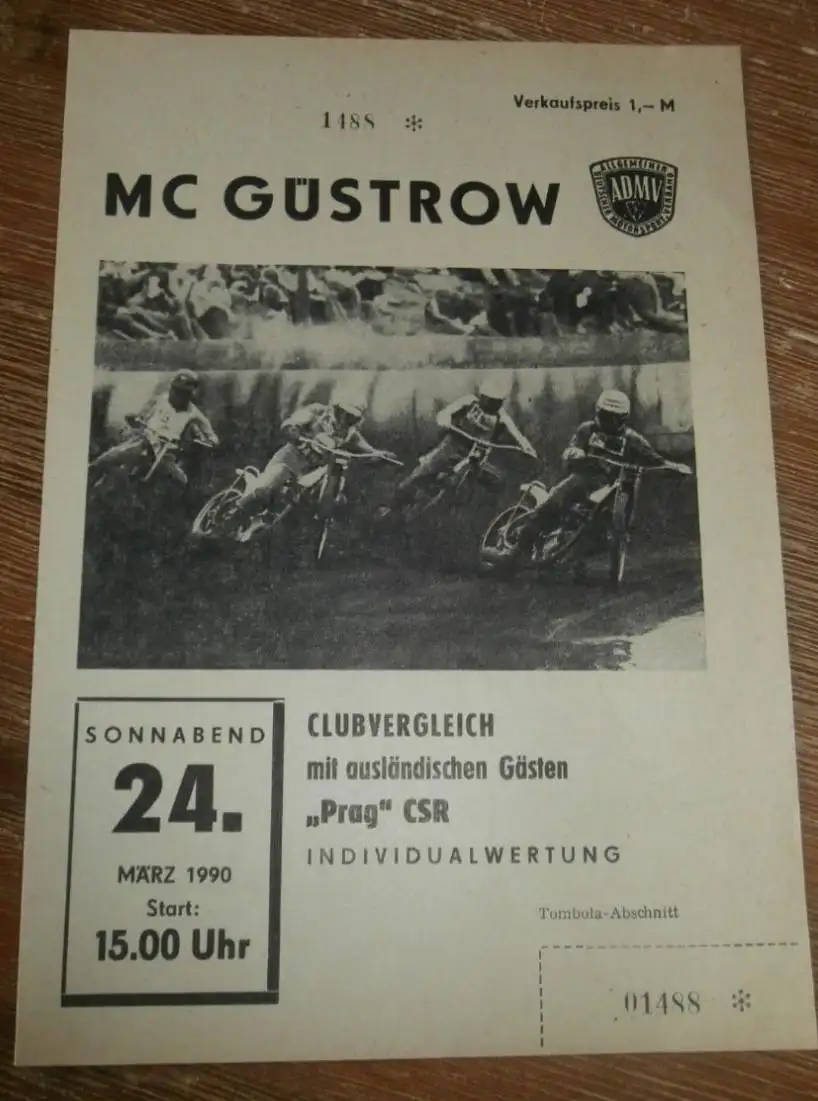 Speedway Güstrow 24.03.1990 , Prag , Programm , Rennprogramm !!!