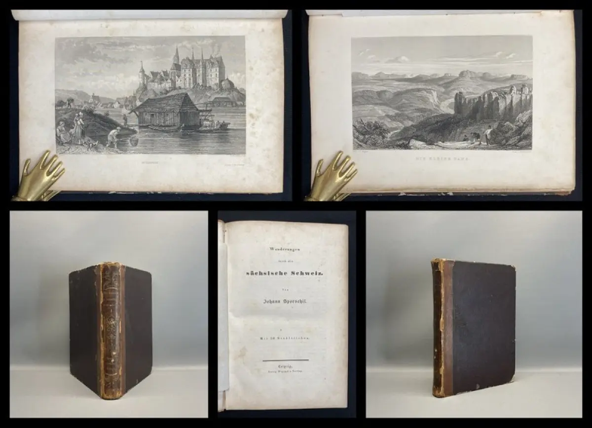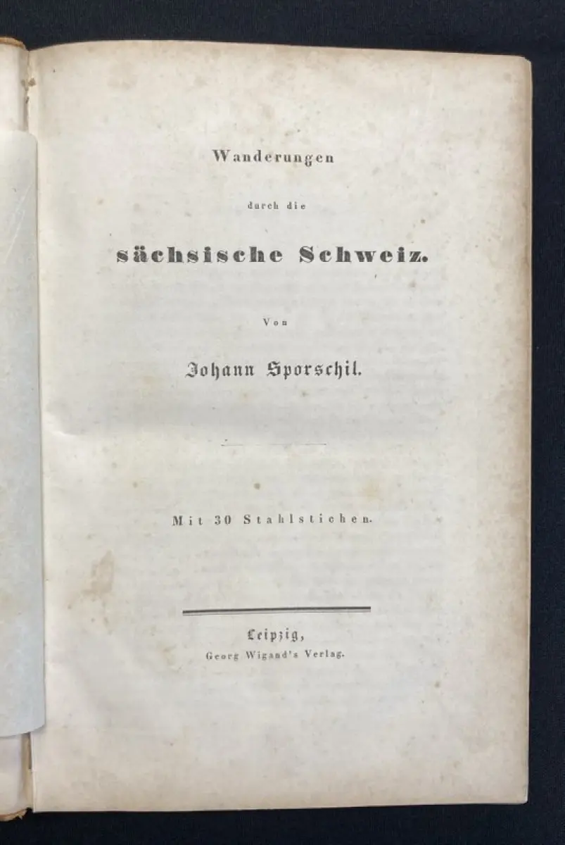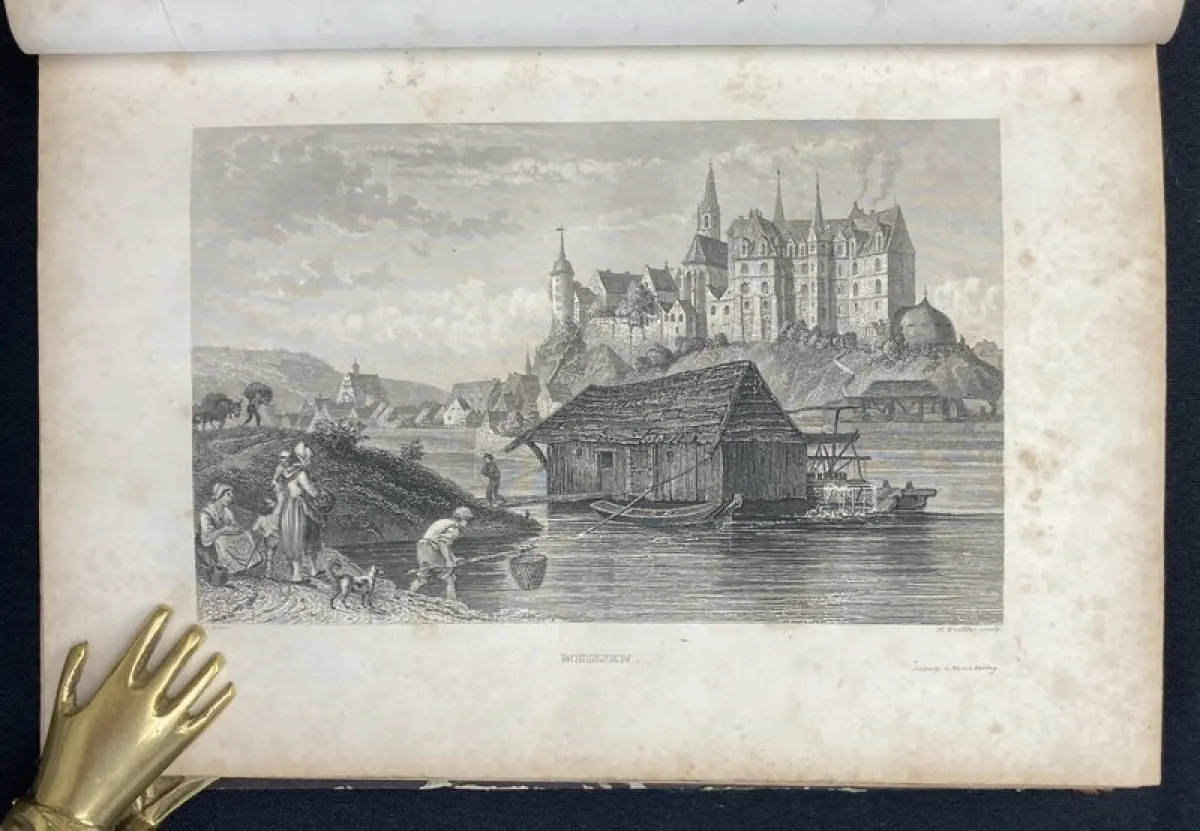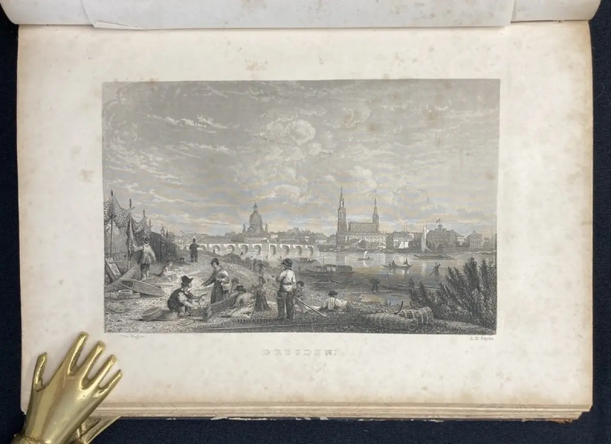 Einband stärker berieben und bestoßen, Rücken und Ecken mit Fehlstellen. Außengelenke angeplatzt. Papier gering gebräunt, durchgehend braun- und fingerfleckig. Mit 29 (von 30) Stahlstichen, die Ansicht von Leipzig fehlt zwischen S.8 und 9. Vorsatz mit kleinem Stempel.