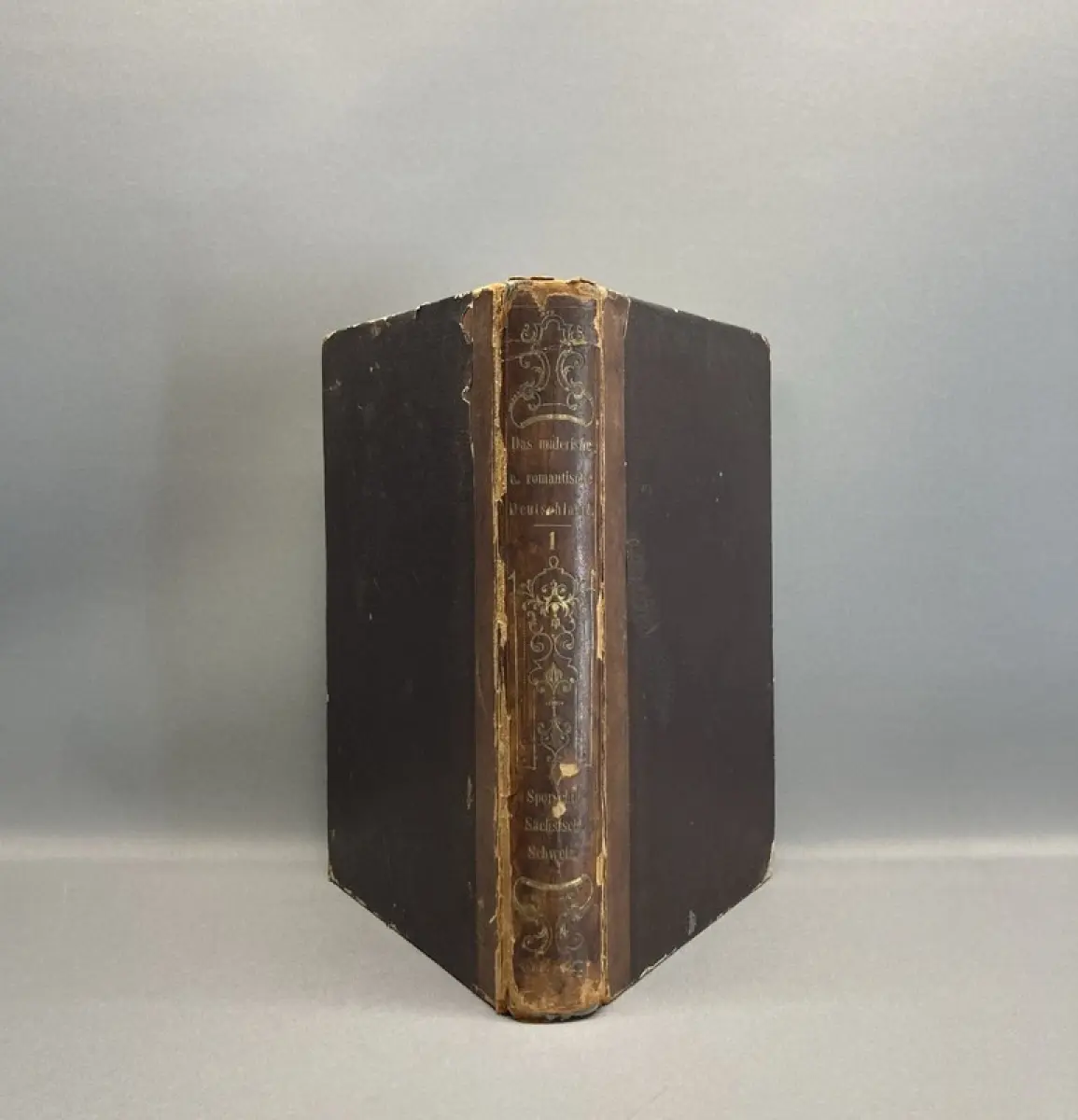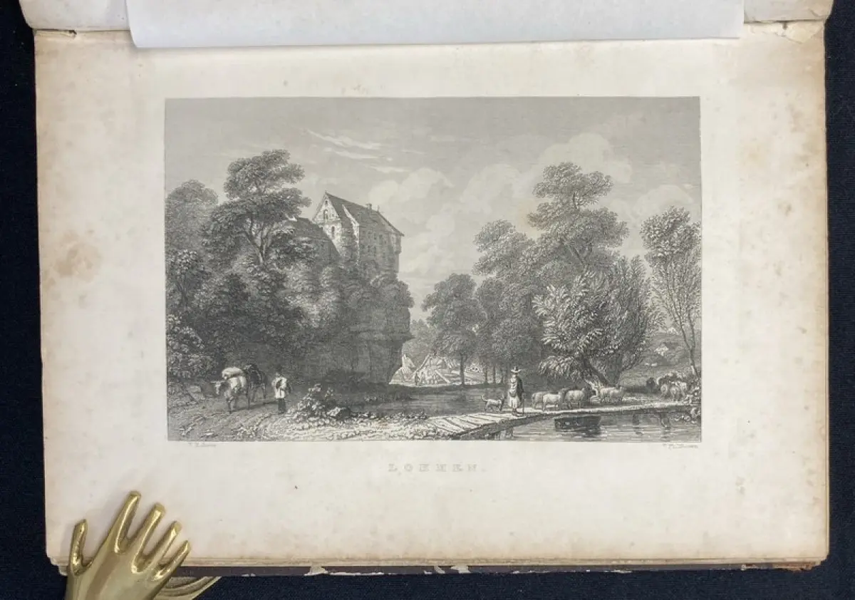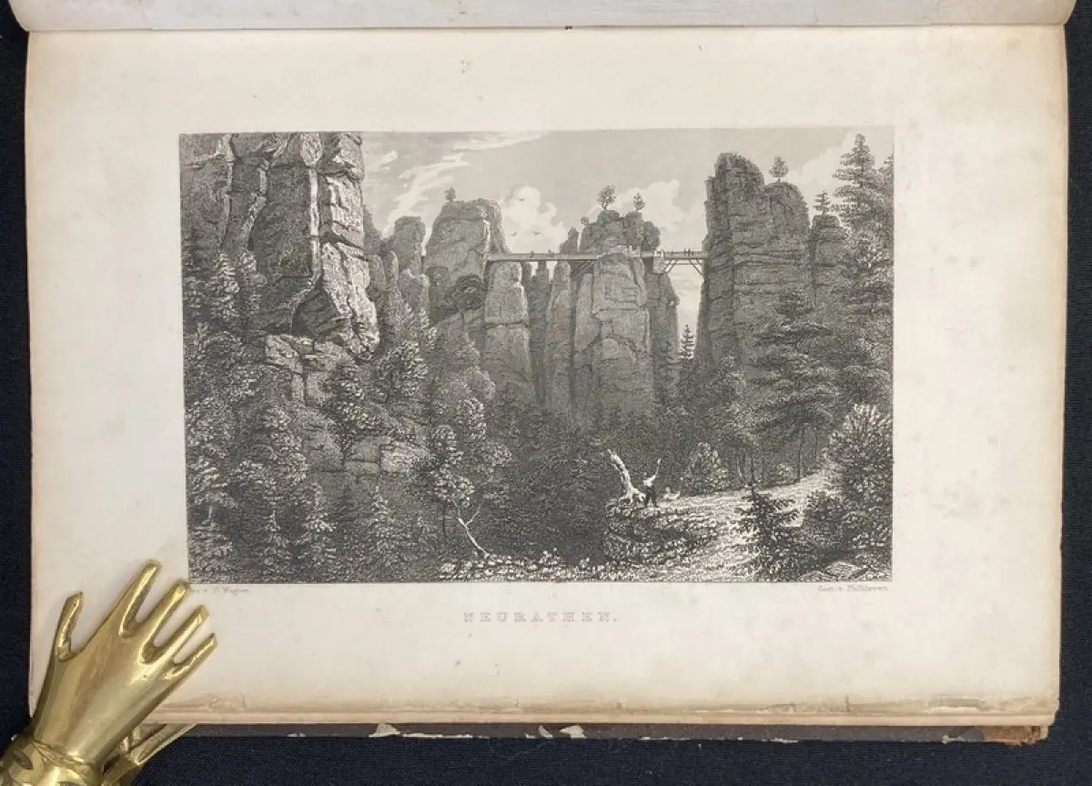 Einband stärker berieben und bestoßen, Rücken und Ecken mit Fehlstellen. Außengelenke angeplatzt. Papier gering gebräunt, durchgehend braun- und fingerfleckig. Mit 29 (von 30) Stahlstichen, die Ansicht von Leipzig fehlt zwischen S.8 und 9. Vorsatz mit kleinem Stempel.