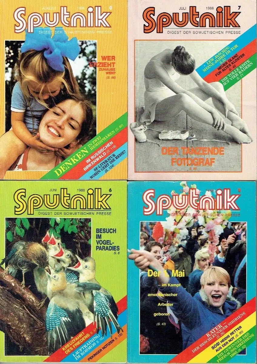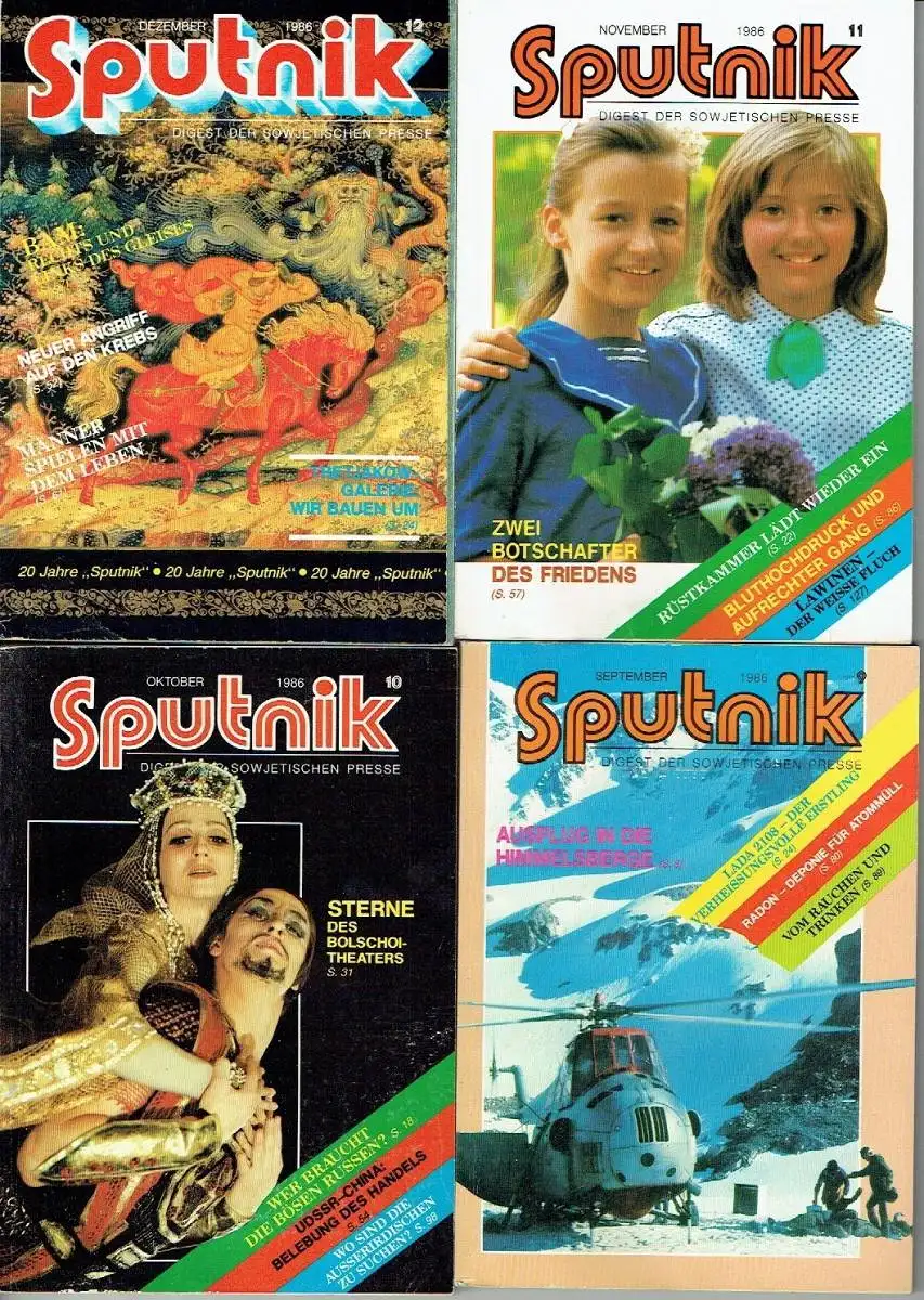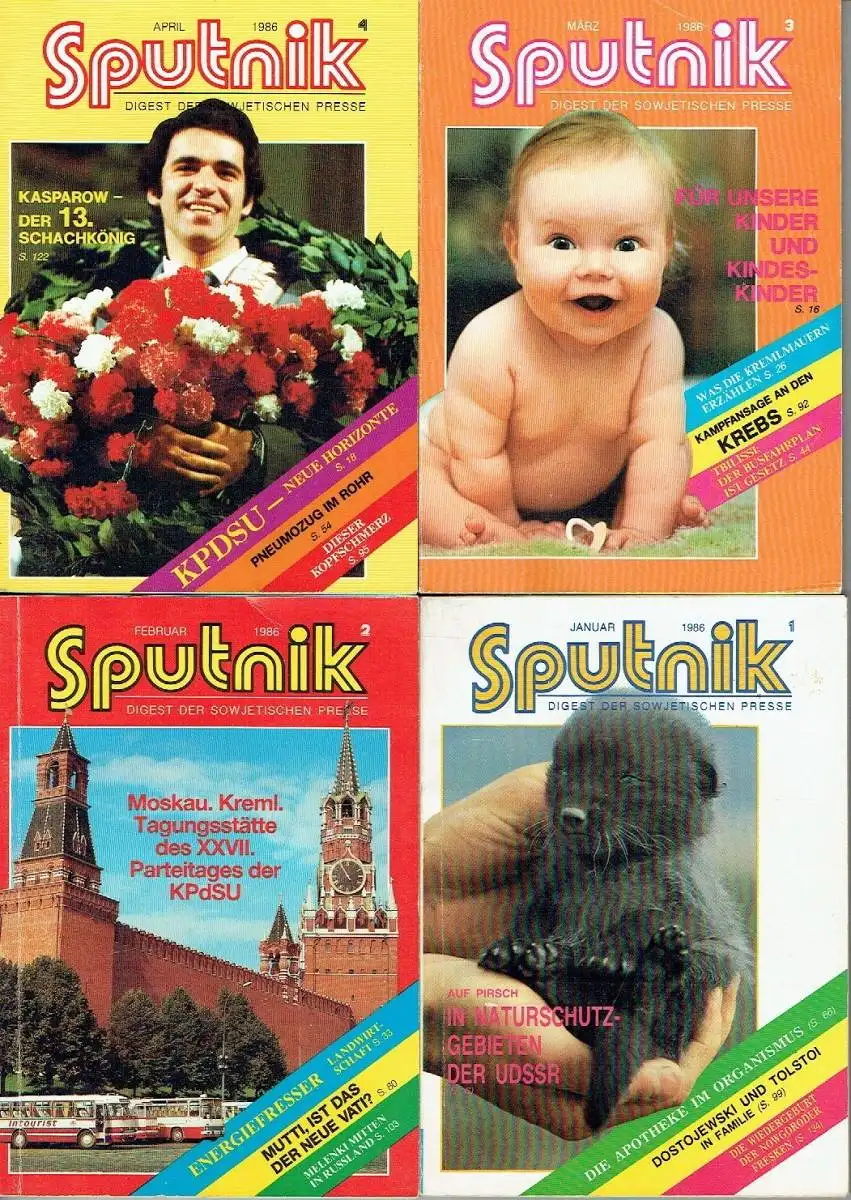 guter bis sehr guter Zustand, geringe Gebrauchs- und Alterungsspuren: gelegentlich kleinere Blessuren - alle Rückseiten mit Adressaufkleber, Die Zeitschrift Sputnik (russisch: Begleiter) wurde 1967 gegründet und von der sowjetischen Nachrichtenagentur Nowosti in mehreren Sprachen herausgegeben. Zielgruppe war das sozialistische und westliche Ausland. Sie diente bis etwa 1991 als publizistischer Botschafter der Sowjetunion. Sputnik verstand sich als Digest der sowjetischen Presse und führte dies auch als Untertitel. Entsprechend erschienen Artikel aus allen Bereichen von Politik, Kultur, Wissenschaft und Gesellschaft, meist durchgehend mit farbigen Illustrationen und Fotos sowie von redaktionellen Beiträgen kommentiert. Die kulturelle Vielfalt der verschiedenen Nationalitäten und der regionalen geografischen und klimatischen Verhältnisse des Landes wurde dokumentiert. Auch ein Russisch-Kursus war Bestandteil. Die Zeitschrift war im Kleinformat auf Hochglanzpapier gedruckt und broschiert. Sie wurde zum Teil in Finnland gedruckt. Da die Zielgruppe auch im Westen lag, bemühte sich die Redaktion, auf ein Übermaß sozialistischer Rhetorik zu verzichten und, in begrenztem Umfang, auch leicht systemkritische Aspekte einzubringen. Die deutschsprachige Ausgabe wurde sowohl in der DDR als auch in der Bundesrepublik vertrieben. Besonders beliebt waren auch die Radio-Jerewan-Witze, die häufig Schwächen des Sozialismus aufs Korn nahmen. Im Zuge der Glasnost- und Perestroika-Politik des KPdSU-Generalsekretärs Michail Gorbatschow nahm die kritische Berichterstattung auch in der Zeitschrift Sputnik zu. Die DDR-Bürger erfuhren dadurch über die politischen Umwälzungen in der Sowjetunion und lasen über Verbrechen Stalins, der mit Hitler verglichen wurde. Bislang verfemte Künstler wurden in Sputnik-Artikeln rehabilitiert, sodass die Zeitschrift in der DDR immer begehrter wurde." (Wikipedia), Softcover, ca. 13,5 x 19, je ca. 175 Seiten mit zahlreichen Bildern
