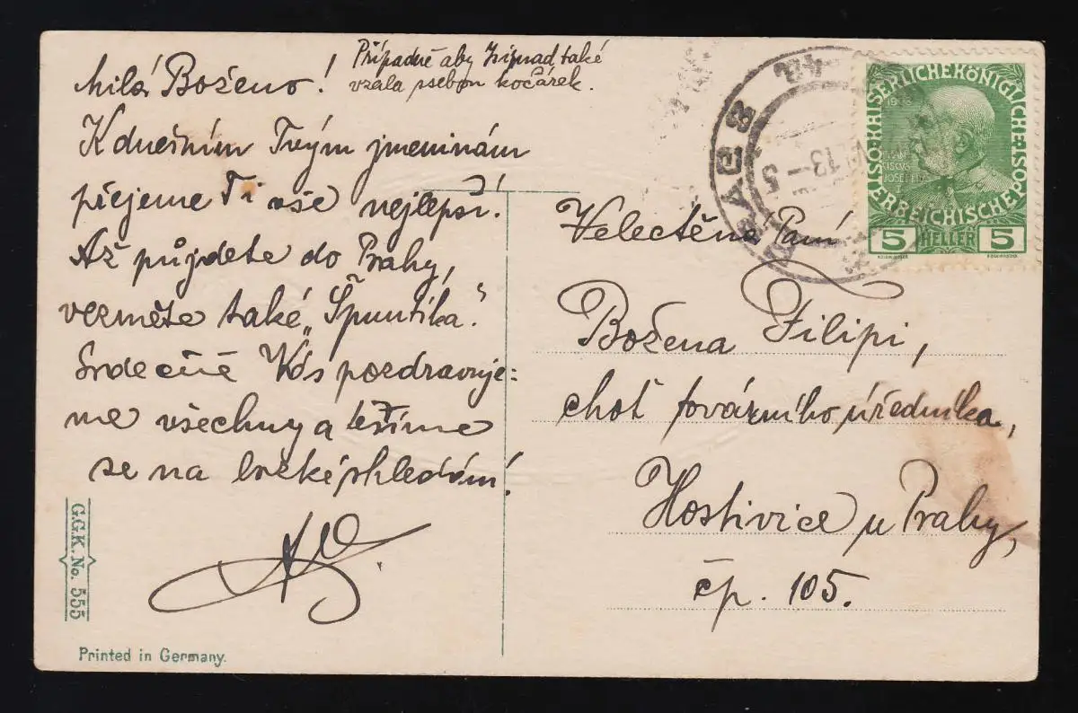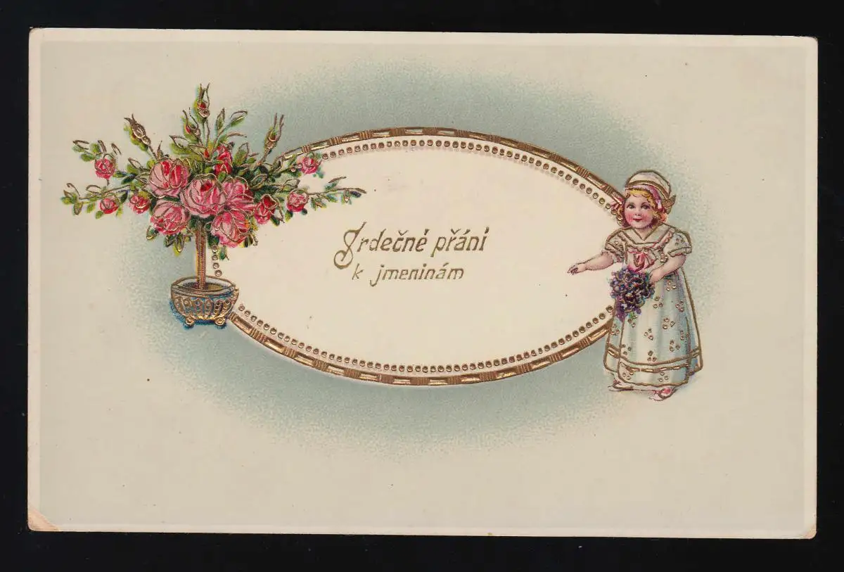 Srdečné přání k jmeninám Rosier cadre en or enfant avec fleurs, Prague vers 1908