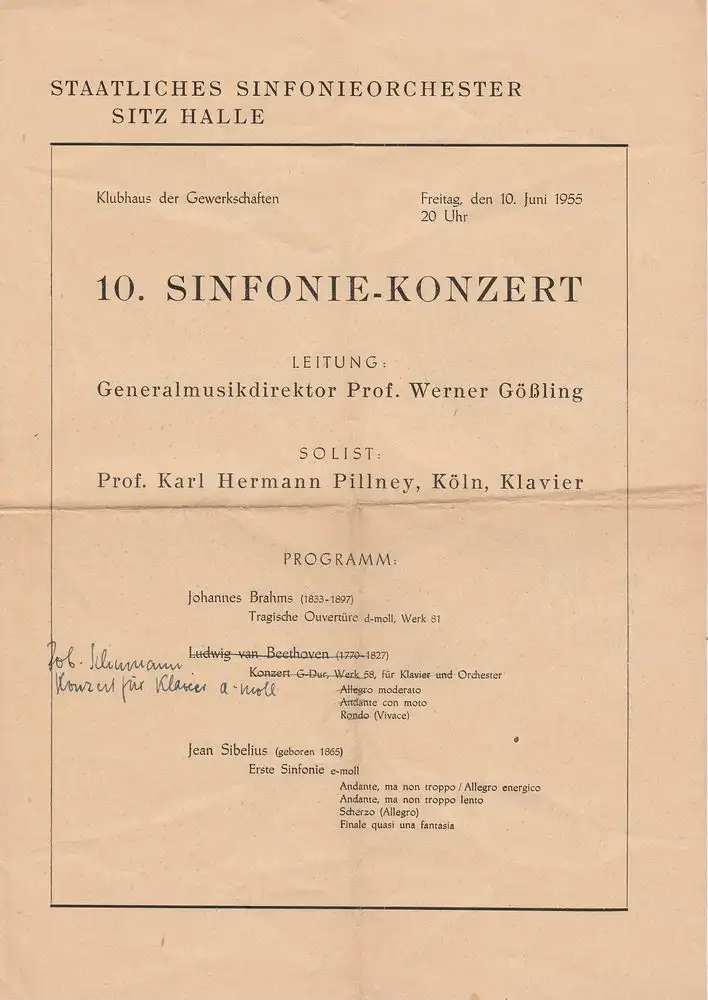 Musikalische Leitung: Werner Gößling. Solist: Hermann Pillney. Programm: Johannes Brahms Tragische Overtüre d-moll, Robert Schumann Konzert für Klavier a-moll ( anstatt Ludwig van Beethoven Konzert G-Dur ), Jean Sibelius Erste Sinfonie e-moll - Theaterprogramm, Opernprogramm, Ballettprogramm, Musicalprogramm, Konzertprogramm, Theatermemorabilia, Programmhefte Sammlung, deutsche Theatergeschichte.