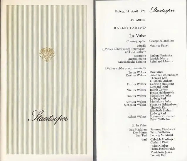 Titel: Staatsoper Wien. Saison (Jahr): 1978 . LA VALSE. Programmheft und Besetzungsliste. Ballettabend. Premiere. Musik : Maurice Ravel. Choreographie : George Balanchine. Kostüme : Barbara Karinska. Einstudierung : Patricia Karinska. Musikalische Leitung : Reinhard Schwarz. LIEDER OHNE WORTE. Musik : Felix Mendelssohn-Bartholdy. Choreographie : Hans van Manen. DON JUAN: Musik : Christoph W.Gluck. Choreographie/Inszenierung : John Neumeier.. Einstudierung : Ray Barra. Musikalische Leitung: Reinhard Schwarz./ Bühnenbild und Kostüme: Filippo Sanjust. Tänzer : Susanne Kirnbauer / Franz Wilhelm / Gisela Cech / Gabriele Haslinger / Lisl Maar / Susanne Kirnbauer / Franz Wilhelm / Heinz Heidenreich u.a