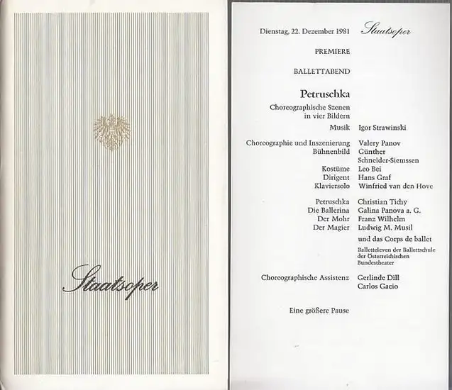 Staats - Oper Wien. -1981: Staatsoper Wien. Saison (Jahr): 1981. Ballettabend. PETRUSCHKA / SCHEHERAZADE. Premiere. Programmheft und Besetzungsliste. Choreographische Szenen in 4 Bildern . Musik : Igor Strawinski. Choreographie / Inszenierung Valery Pano