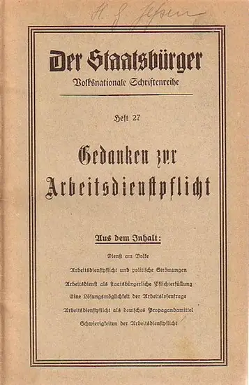 Titel: Der Staatsbürger. Volksnationale Schriftenreihe. Verantwortlich: Ernst Helmers. Heft 27: Gedanken zur Arbeitsdienstpflicht. Aus dem Inhalt: Dienst am Volke / Arbeitsdienstpflicht und politische Strömungen / Arbeitsdienst als staatsbürgerliche Pflichterfüllung / Eine Lösungsmöglichkeit der Arbeitslosenfrage / Arbeitsdienstpflicht als deutsches Propagandamittel / Schwierigkeiten der Arbeitsdienstpflicht. Herausgegeben im Ordensamt des Jungdeutschen Ordens, Berlin