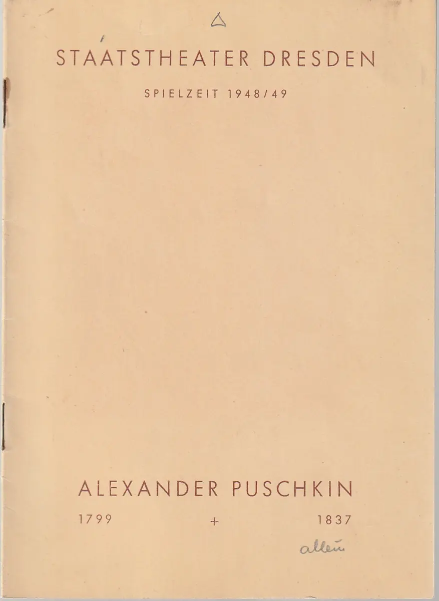Staatstheater Dresden, Günter Haußwald, Otto Dierichs: Programmheft ALEXANDER PUSCHKIN 1799 + 1837 Zum 150. Geburtstag 4. Juni 1949.
