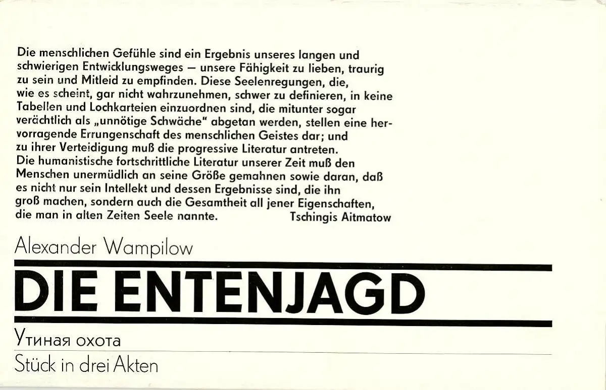 Staatstheater Dresden, Staatsschauspiel, Karla Kochta, Ekkehard Walter: Programmheft Die Entenjagd. Stück von Alexander Wampilow. Premiere 27. November 1980.