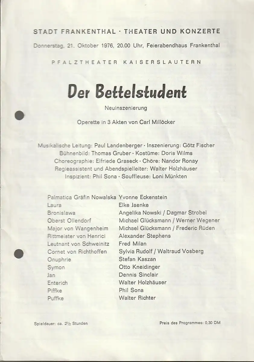 Stadt Frankenthal, Theater und Konzerte, Feierabendhaus Frankenthal: Programmheft Carl Millöcker DER BETTELSTUDENT 21. Oktober 1976 Feierabendhaus Frankenthal.