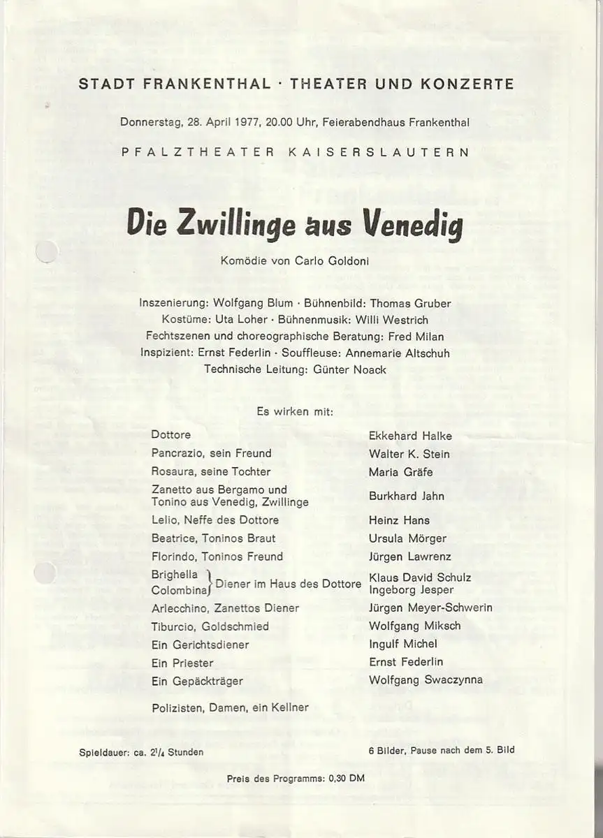 Stadt Frankenthal, Theater und Konzerte, Feierabendhaus Frankenthal: Programmheft Carlo Goldoni DIE ZWILLINGE AUS VENEDIG 28. April 1977.