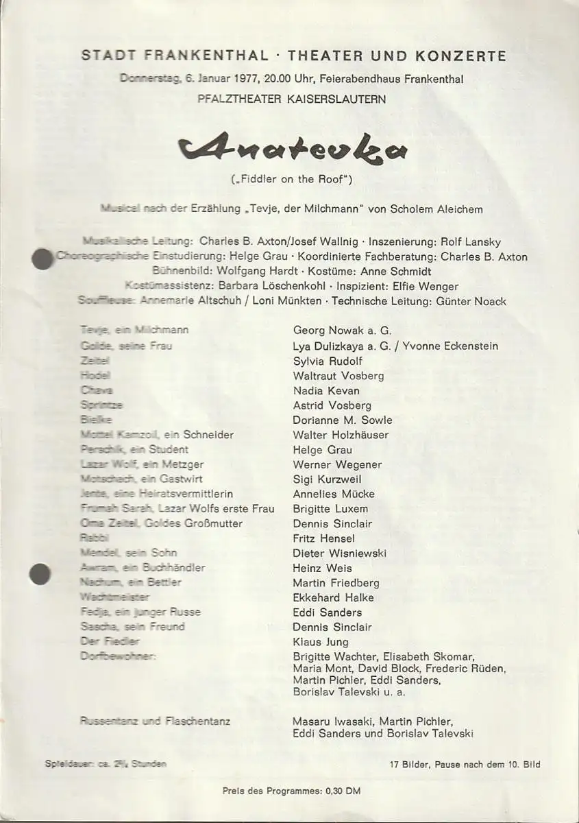 Stadt Frankenthal, Theater und Konzerte, Feierabendhaus Frankenthal: Programmheft Jerry Bock ANATEVKA 6. Januar 1977 Feierabendhaus Frankenthal ( Fiddler on the Roof ).