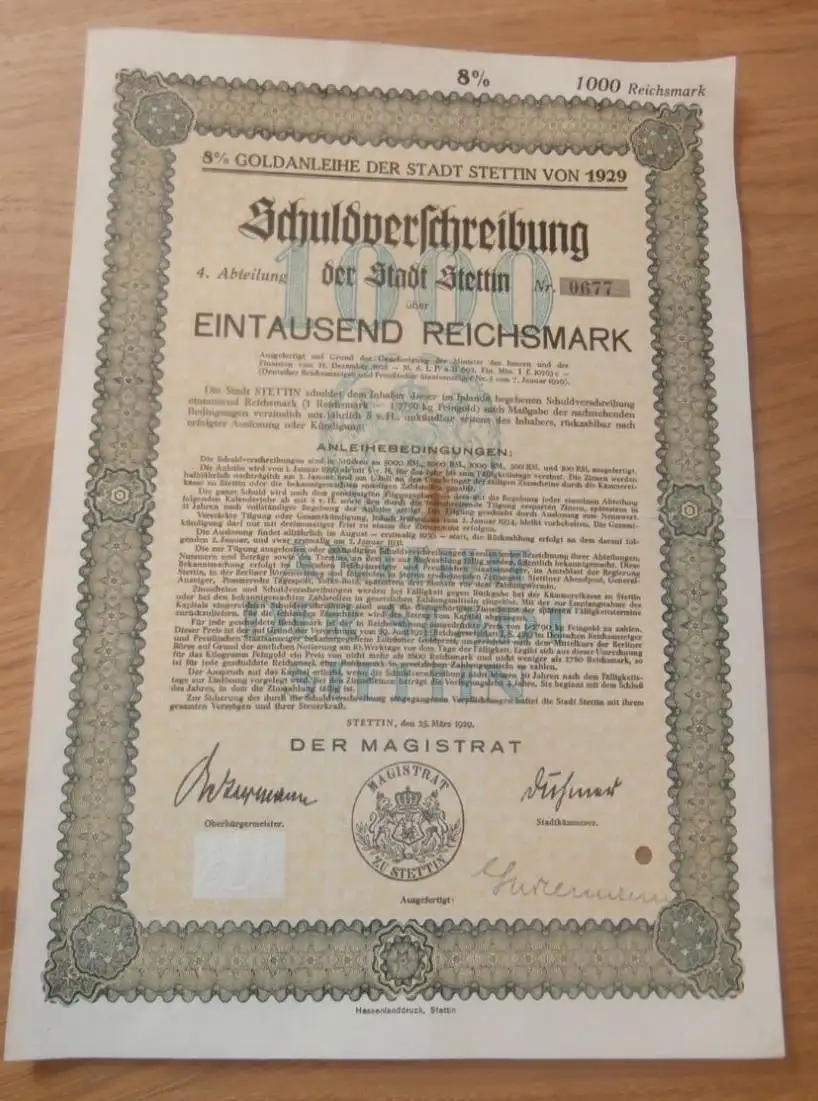 Stadt Stettin i. Pommern , 1929 , 1000 RM , Schuldverschreibung / Anleihe !!!AZB-1/WR3