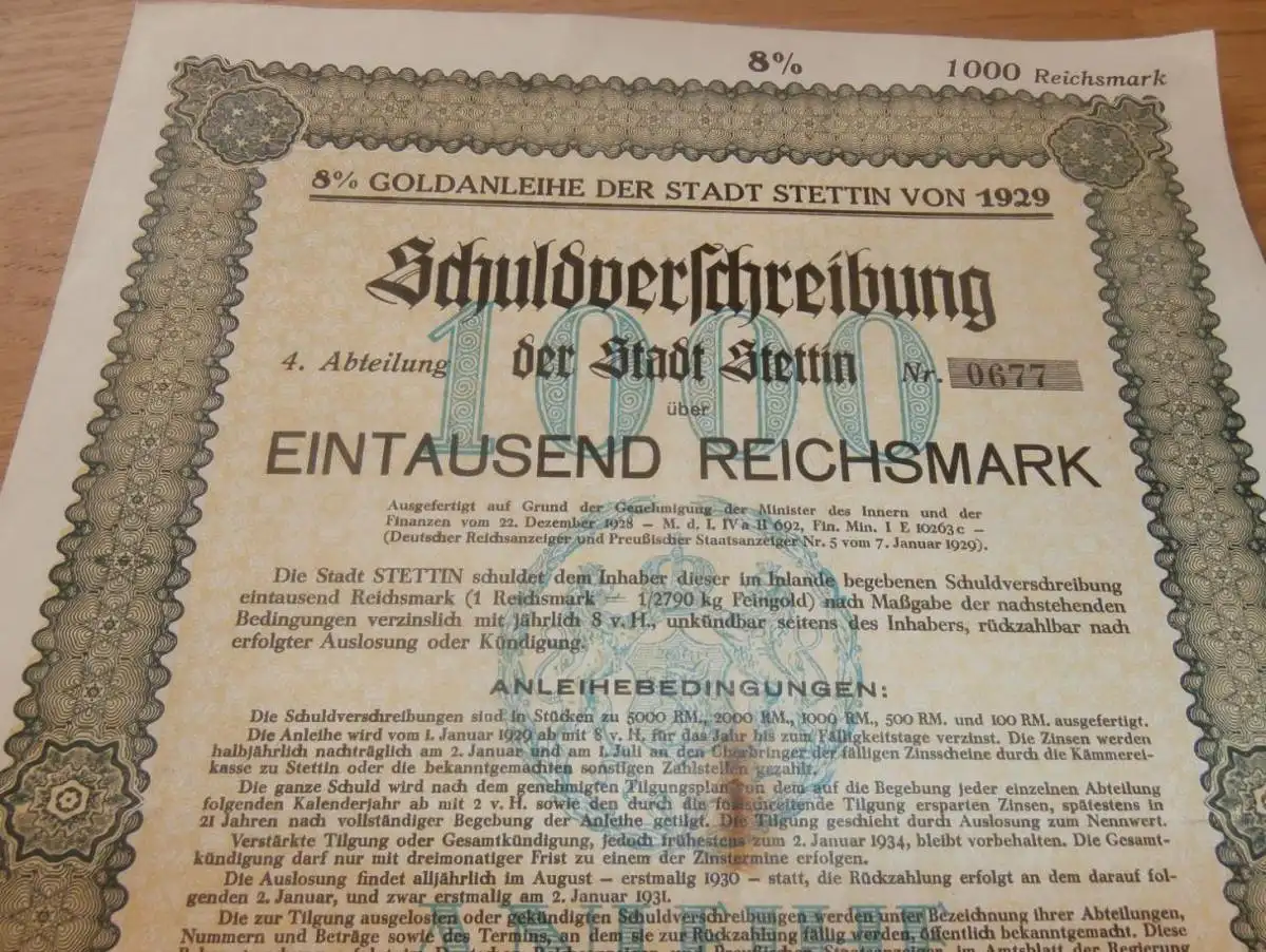 Stadt Stettin i. Pommern , 1929 , 1000 RM , Schuldverschreibung / Anleihe !!!