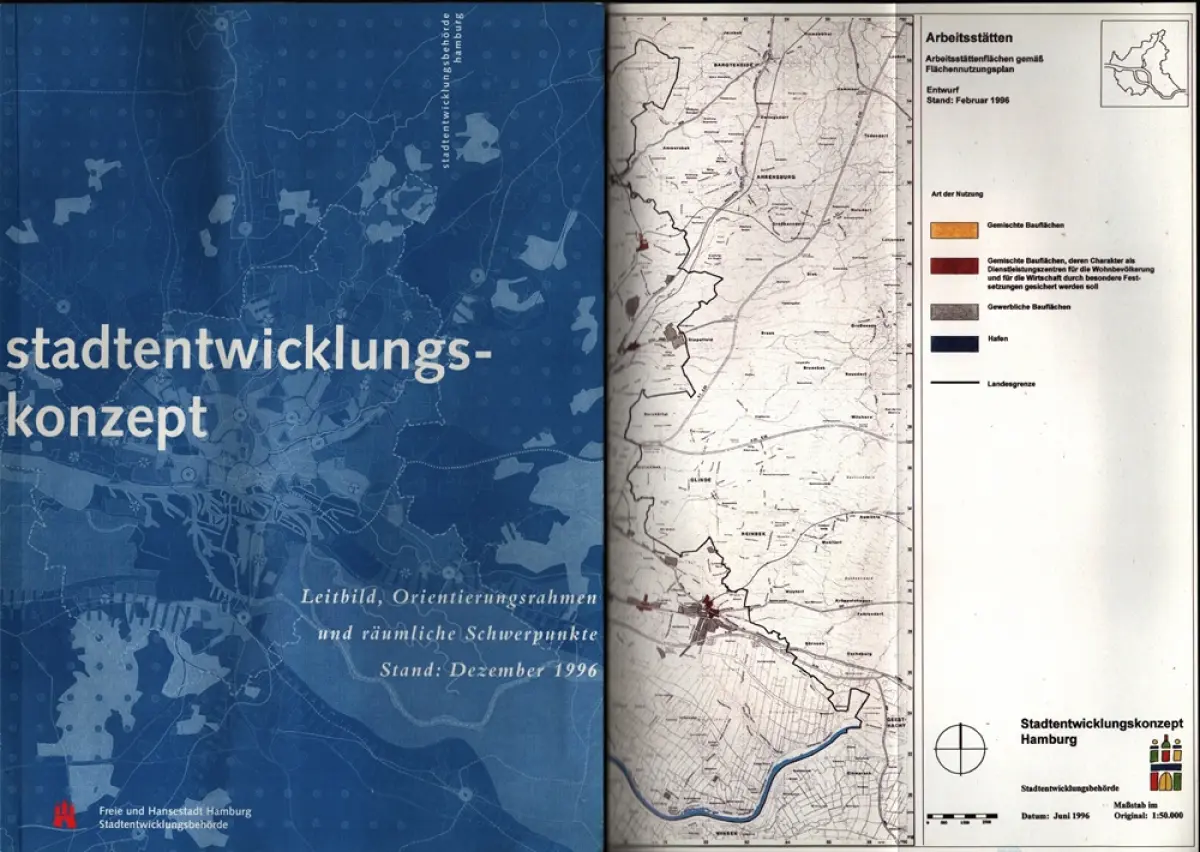 Titel: Stadtentwicklungskonzept. Leitbild, Orientierungsrahmen und räumliche Schwerpunkte. (Hrsg.: Freie und Hansestadt Hamburg, Stadtentwicklungsbehörde, Referat für Öffentlichkeitsarbeit). Stand Dezember 1996. (2. Aufl.)