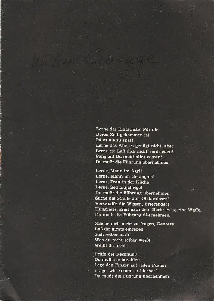 original Heft, 15 Seiten, mit Handlungsablauf, Artikel über die Courage Musik und Abdruck des Liedes der Courage. Zustand: befriedigend, Datum und Titel auf Deckel, Klammer rostig, mit Läsuren