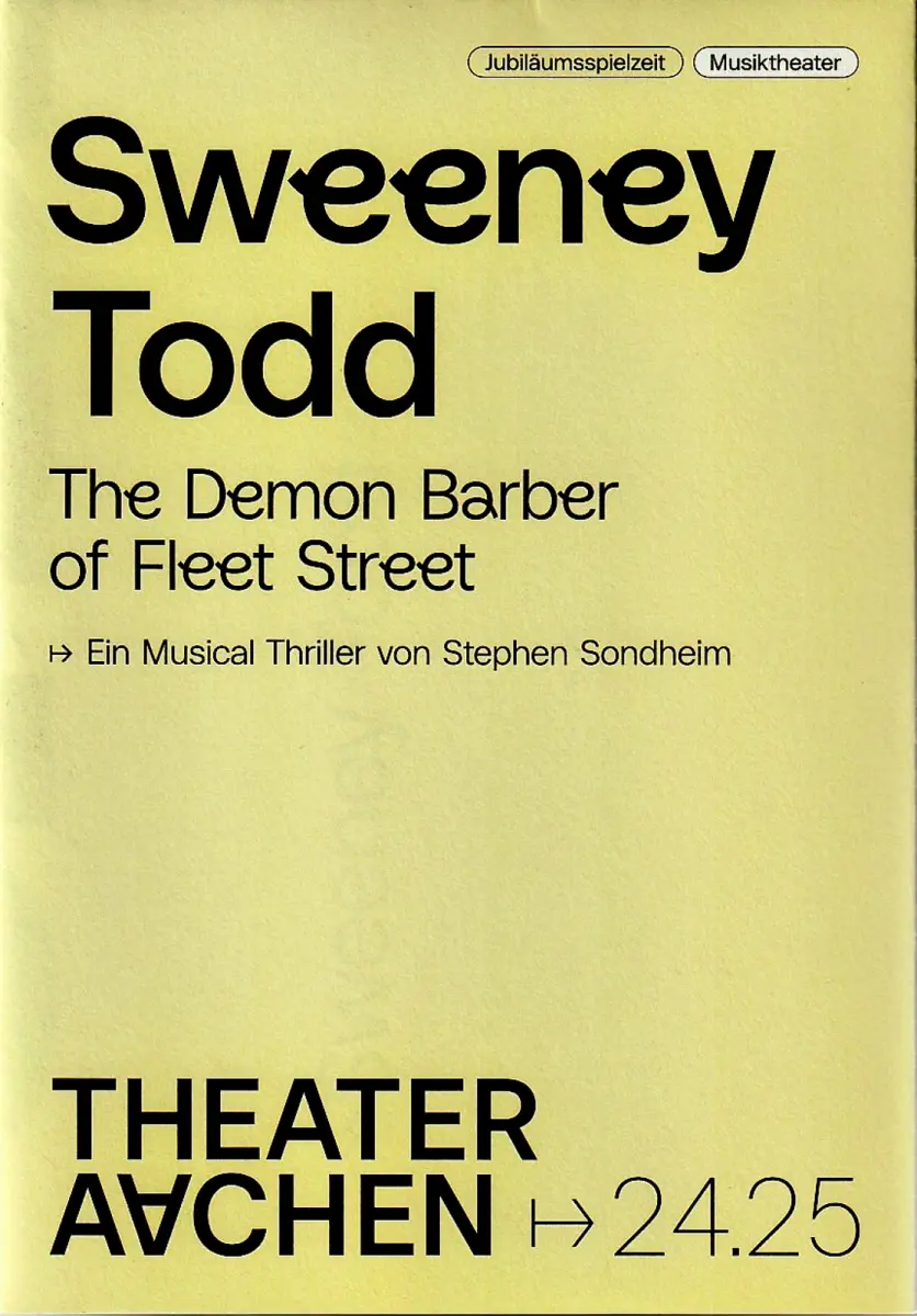 THE DEMON BARBER OF FLEET STREET. Ein Musical Thriller. Musik und Gesangstexte: Stephen Sondheim. Buch: Hugh Wheeler. Musikalische Leitung: Hirsoshi Ueno. Regie: Joan Anton Rechi. Bühne: Gabriel Insignares. Kostüme: Sandra Münchow. Mitwirkende: Ronan Collett, Veronika Hörmann, Jorge Ruvalcaba, Jelena Rakic, Marcel Oleniecki, Pawel Lawreszuk, u.a. - Theaterprogramm, Opernprogramm, Ballettprogramm, Musicalprogramm, Konzertprogramm, Theatermemorabilia, Programmhefte Sammlung, deutsche Theatergeschichte.