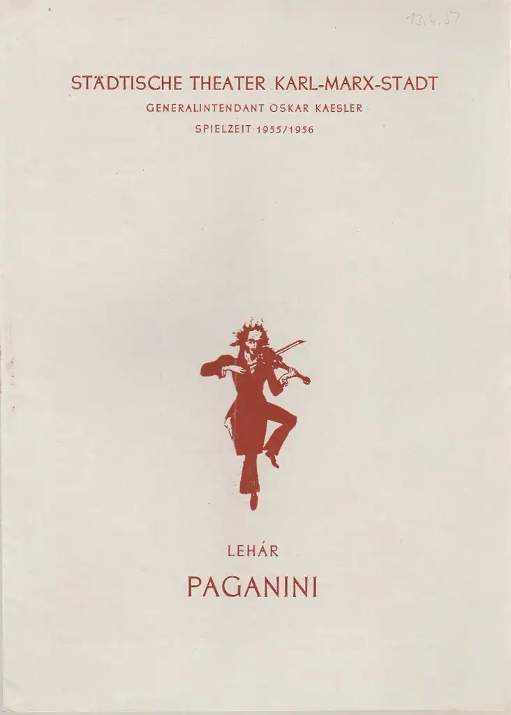 Städtische Theater Karl-Marx-Stadt, Oskar Kaesler, Wolf Ebermann, Burkart Hernmarck, Renate Müller ( Zeichnungen ): Programmheft Franz Lehar PAGANINI Spielzeit 1955 / 56.