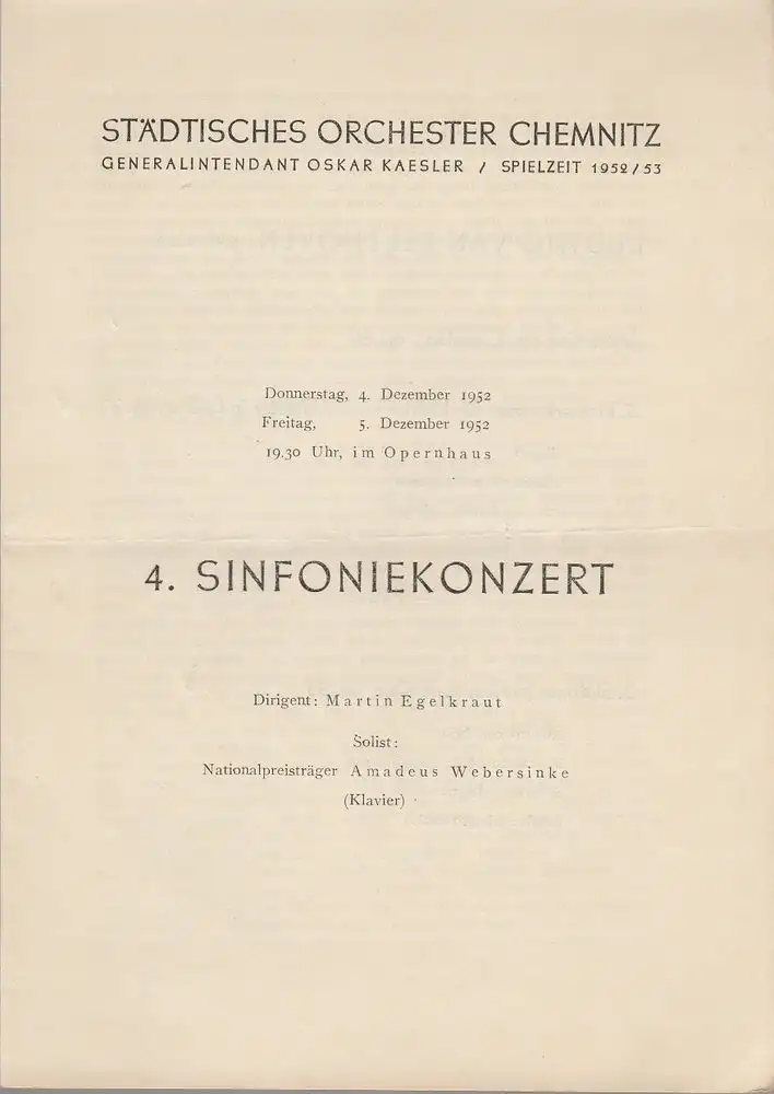 Städtisches Orchester Chemnitz, Oskar Kaesler: Programmheft 4. SINFONIEKONZERT 4. und 5. Dezember 1952 Spielzeit 1952 / 53.
