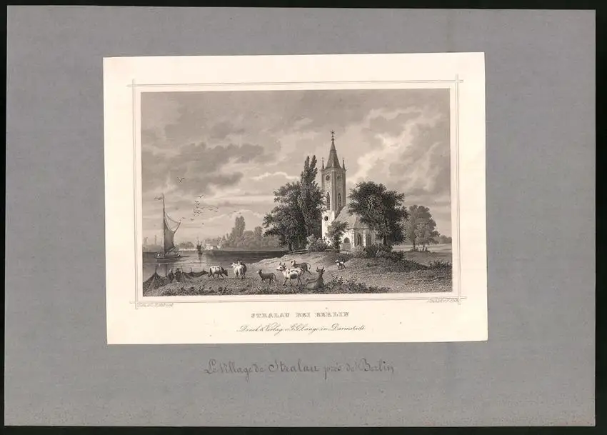 Stahlstich Berlin-Stralau, Kirche am Ufer, montiert, um 1870, gez.: L. Rohbock, Stich: F. Foltz, 22.5 x 31.5cm