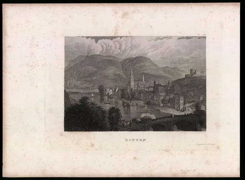 Stahlstich Bingen, Flusspartie mit Kirche, Stahlstich um 1880, 19 x 22cm