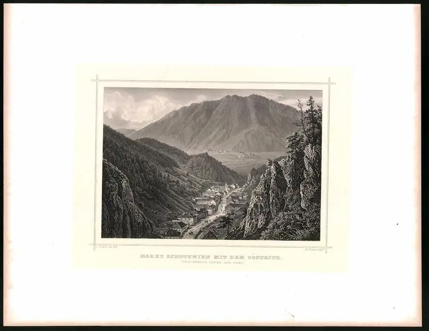 Stahlstich Markt Schottwien mit dem Göstritz, Stahlstich um 1870 aus Ruthner Kaiserthum Österreich, 32 x 25cm