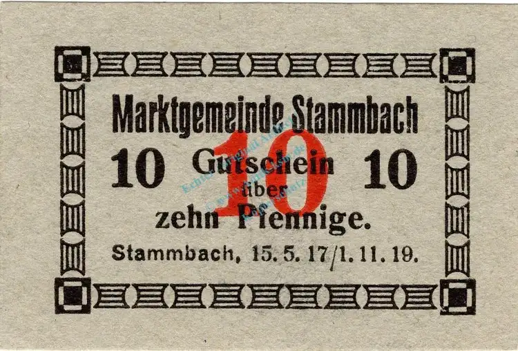 Stammbach , Notgeld 10 Pfennig Schein unc-kfr. Ti.7070.05.71 Bayern 1917 Verkehrsausgabe