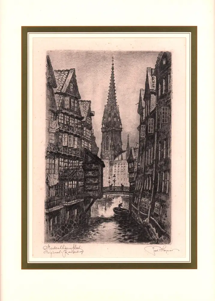 Vom Künstler mit Bleistift bezeichnet u. SIGNIERT. Blick mit dem Fleet auf Nikolaifleet u. Reimersbrücke u. den Kirchturm von St. Nikolai. - Zu dem Tiermaler u. Radierer Ferdinand Höpner [Hoepner] (1882-1967), siehe Vollmer, 459; Der Neue Rump, S. 139. - Das starke Papier schwach gebräunt, mit sehr vereinzelten Stockflecken. Gutes Exemplar