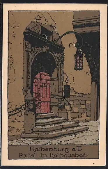 Steindruck-AK Rothenburg o.T., Portal im Rathaushof mit Laterne
