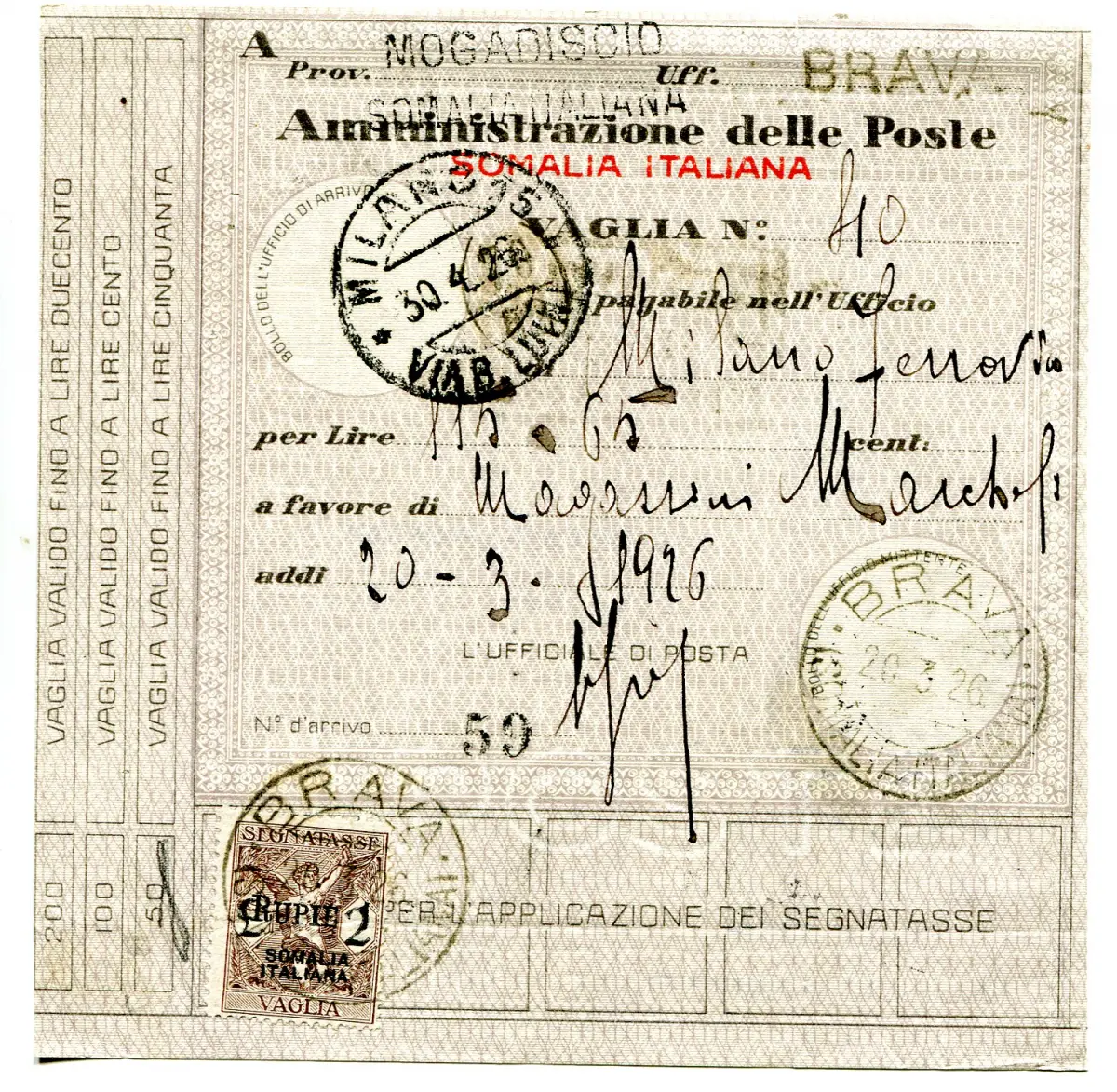 - Somalia - Steuermarken Vaglia 1 Rupie auf Lire 2 Nr. 5 isoliert auf Vaglia Annullierung Brava vom 20.3.26 - sehr guter Erhaltungszustand - Sachsen - Kat. 600 Euro n. 1022/L