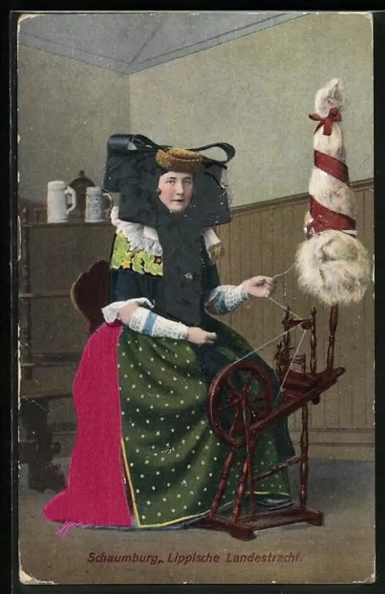 Stoff-Präge-AK Junge Frau posiert am Spinnrad in Schaumburg-Lippischer Landestracht