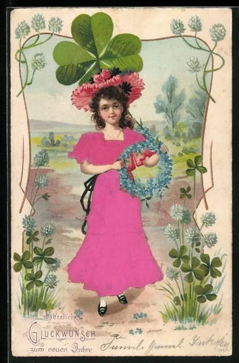 Stoff-Präge-AK Mädchen im Kleid mit Kleeblatt
