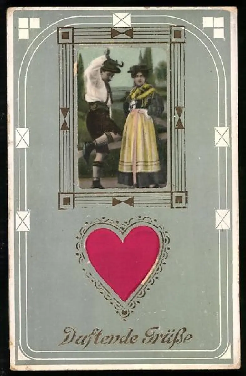 Stoff-Präge-AK Paar beim Volkstanz mit Herz